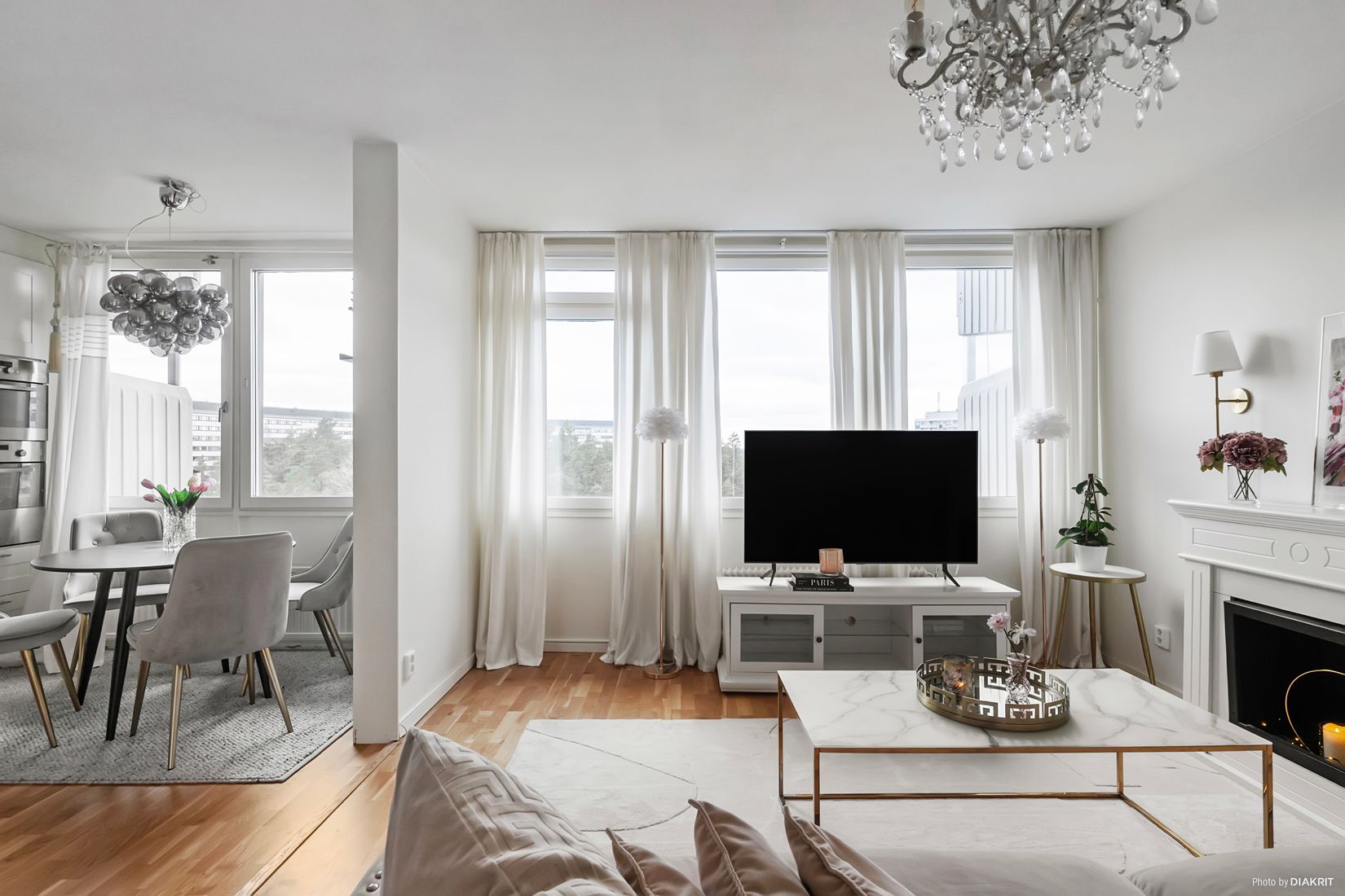 Här bor du på våning 6 med ett fritt och högt läge som låter blicken svepa över låghusen och vidare ut över området. På kvällarna förvandlas utsikten till något alldeles extra – när ljusen tänds i omgivande bostäder skapas en levande, nästan magisk atmosfär som ger hemmet en unik känsla.