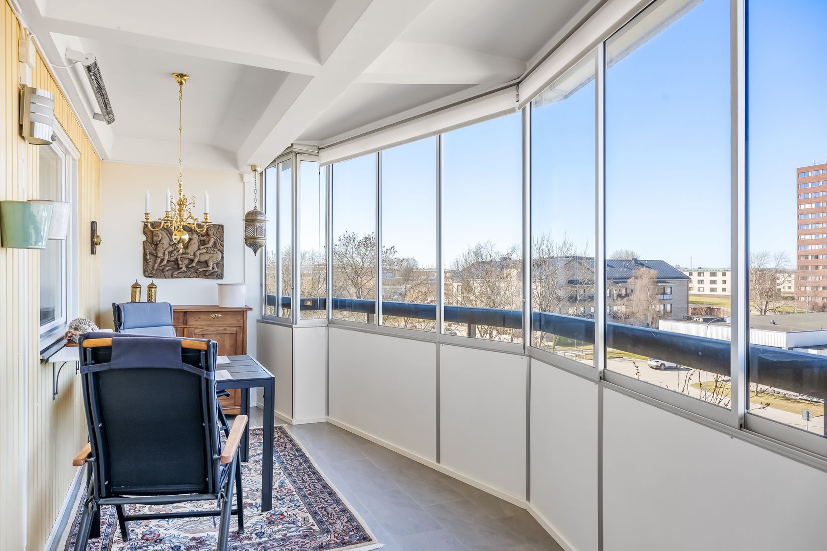 Lägenheten ligger bekvämt på våning 4 med hiss och bjuder på ett fint ljusinsläpp samt en stor inglasad balkong som blir som ett extra rum större delen av året.