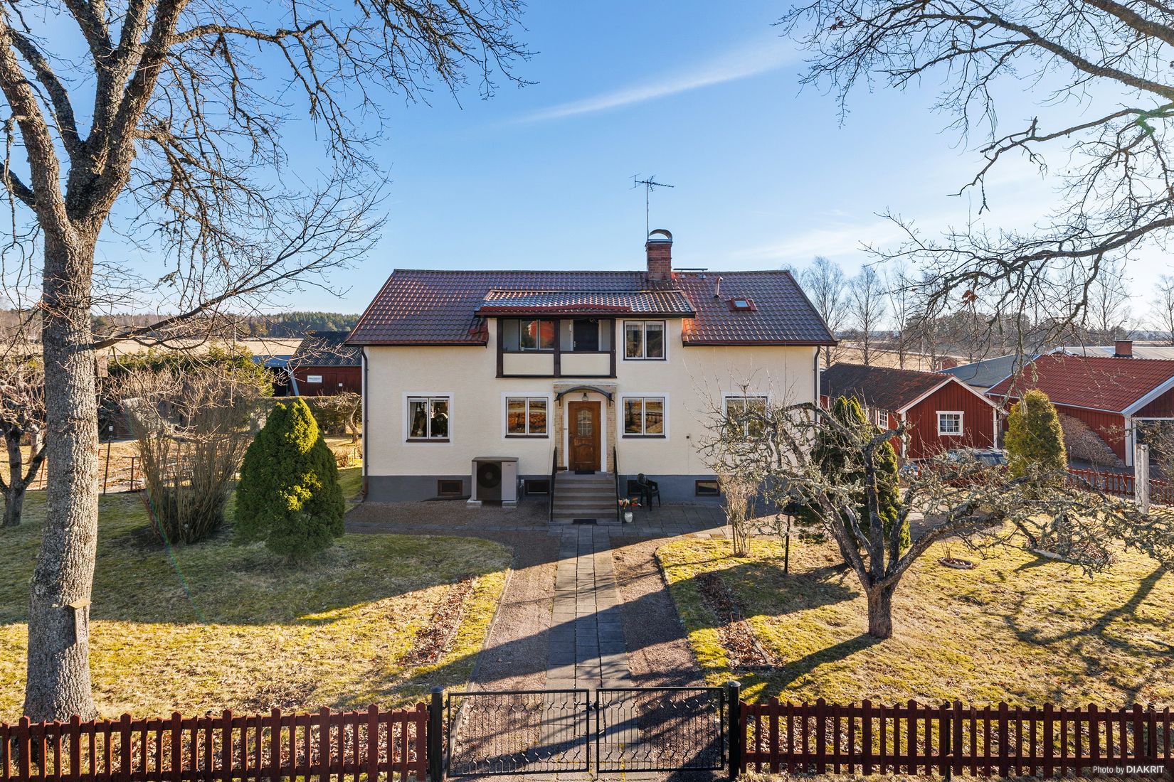 Solig och uppvuxen tomt med vackra, stora träd som skapar en rofylld och insynsskyddad miljö. Här finns gott om plats för lek, trädgårdsliv och sociala stunder under årets varmare månader. På tomten finns även en praktisk förrådsbyggnad som ger ytterligare förvaringsmöjligheter.