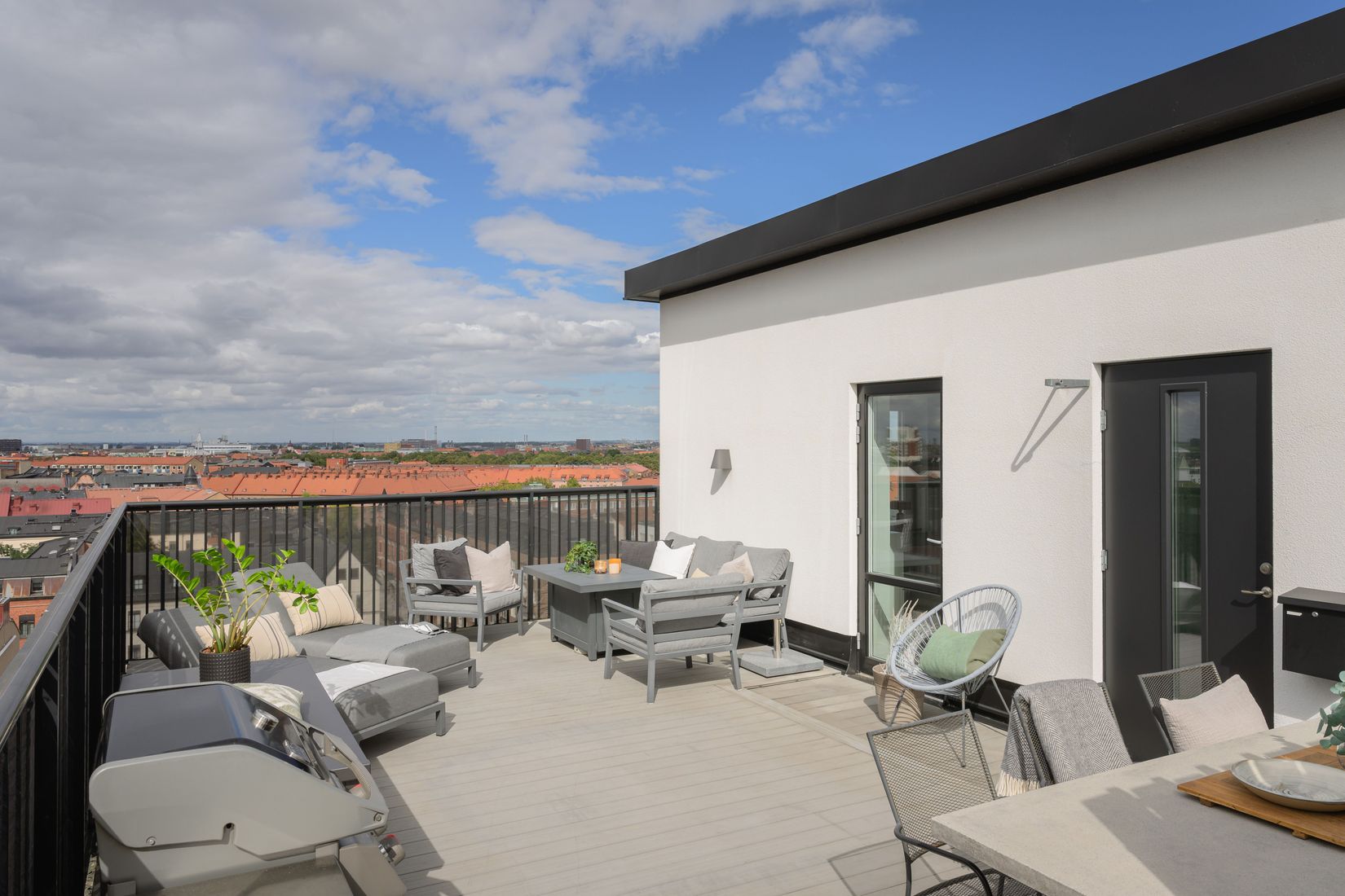 Den stora terrassen blir bostadens naturliga samlingspunkt. Med plats för matbord, loungemöbler, grill, odlingslådor och mer därtill utgör den ett extra "uterum" som förlänger boendesäsongen från vår till höst. Här finns gott om utrymme för sociala middagar, avkoppling i solen eller odling för den trädgårdsintresserade.