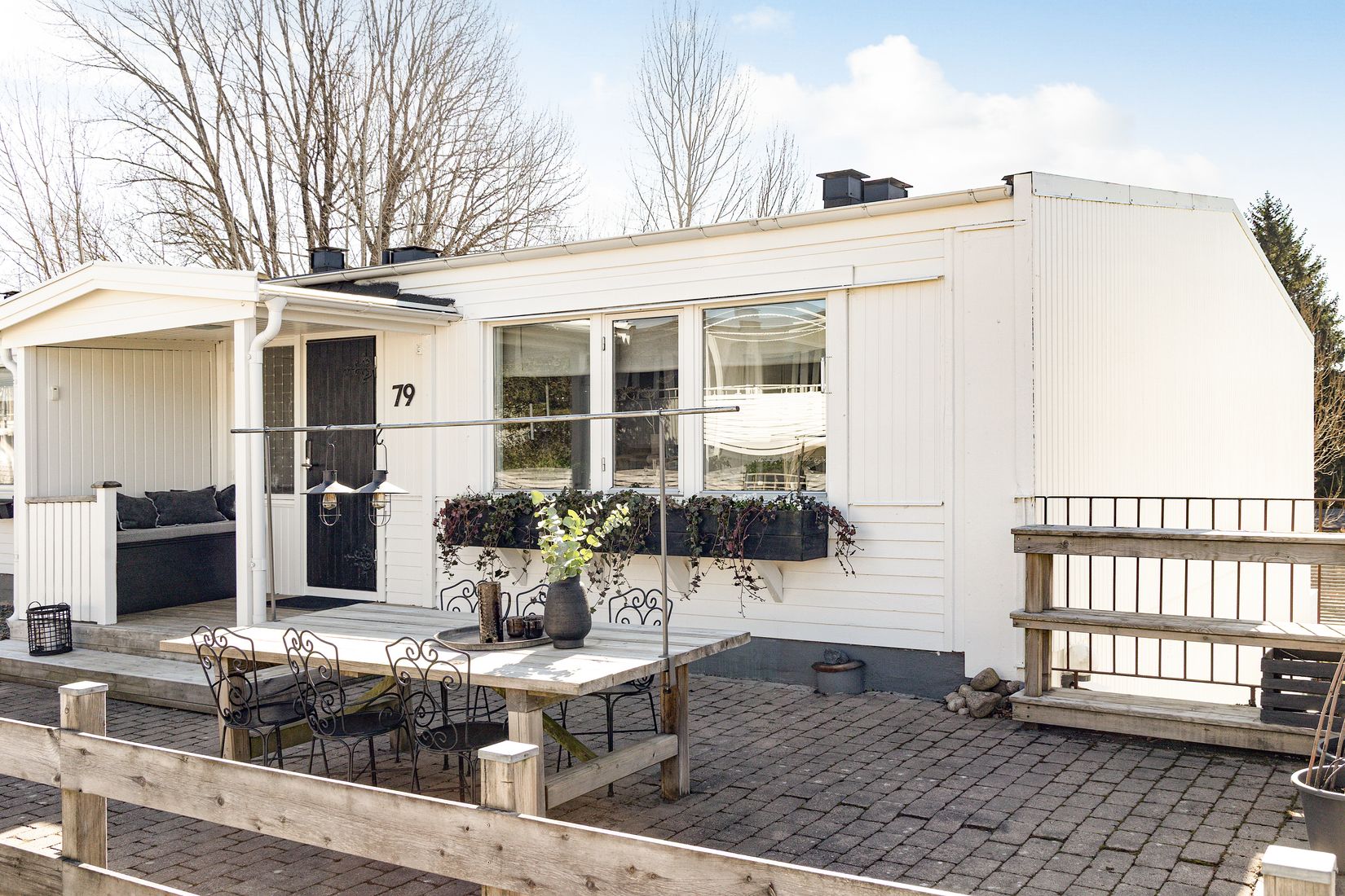 Utemiljön är något alldeles extra, med fina uteplatser på båda sidor av huset. På entrésidan njuter du av eftermiddags- och kvällssol, medan balkongen i söderläge bjuder på härlig morgon- och förmiddagssol. Under balkongen finns ytterligare en inbjudande uteplats på trädäck i anslutning till trädgården.