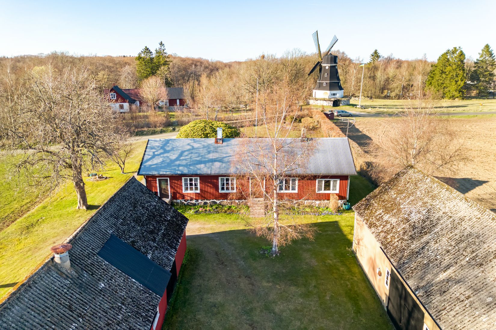 Fastigheten omges av ett böljande Österlenskt landskap, där åkrar, skog och öppna vyer bildar en ständigt föränderlig naturtavla. Direkt intill gården står den vackra möllan – ett landmärke som förstärker känslan och områdets lantliga charm. Här får du ett boende med unik miljö, stillhet och naturen, rikt djurliv som närmaste granne.