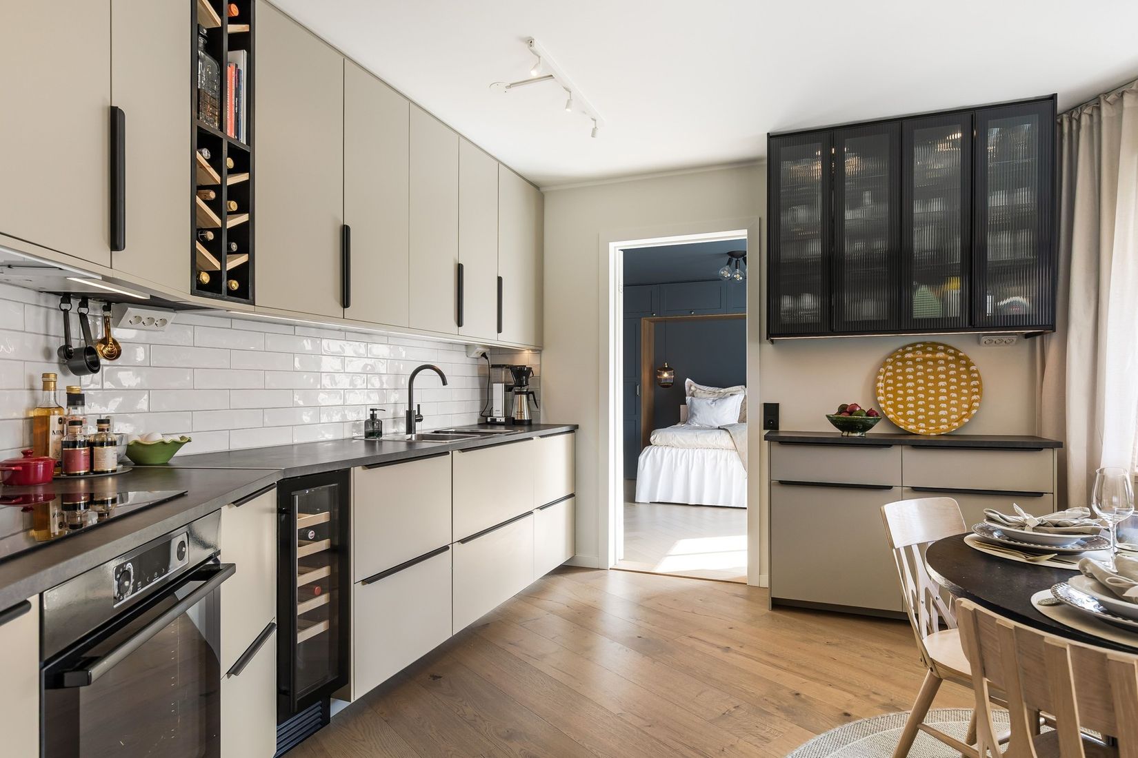 Vidare in möts ni av det generösa köket och vardagsrummet. Köket är modernt och smakfullt utformat med goda arbetsytor och genomtänkt förvaring. Samtliga vitvaror döljs smakfullt bakom skåpfronter och bidrar till ett stilrent helhetsintryck. Här finns även vinkyl samt en praktisk nisch som lämpar sig perfekt som kaffestation. Matplatsen är naturligt placerad vid fönsterparti i söder mot Eskilstunavägen, vilket skapar en ljus och trivsam plats för både vardag och umgänge.