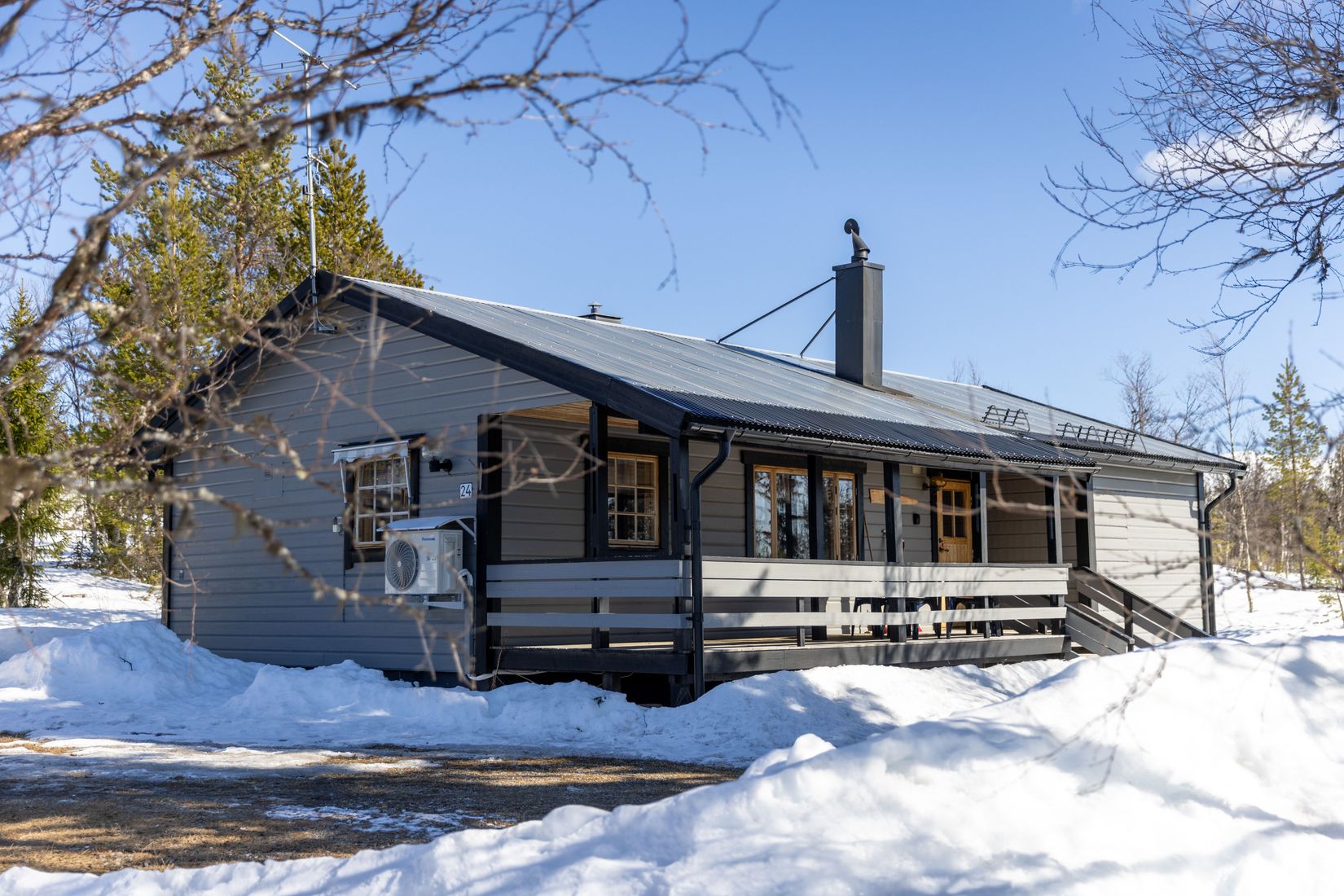 Stugan är beläget på en lugn gata, med närhet till längdspår och skoterled — idealiskt för både vinteraktiviteter och sommarfriluftsliv.