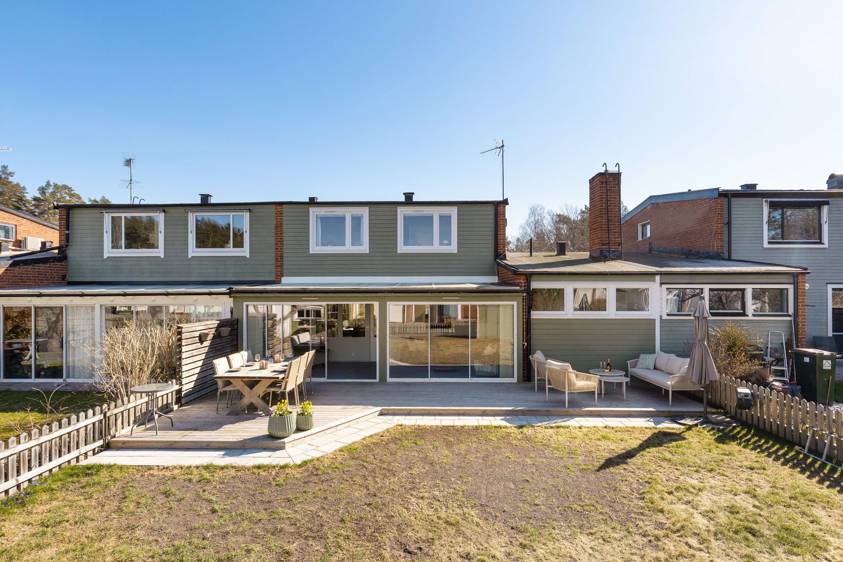 Utemiljön är minst lika genomtänkt som insidan. Framsidan erbjuder förmiddagssol och plats för utemöbler, medan baksidan bjuder på en privat och trivsam miljö med eftermiddag- och kvällssol – perfekt för grillkvällar, lek och odling. Här finns plats för både studsmatta och sociala ytor för hela familjen.
