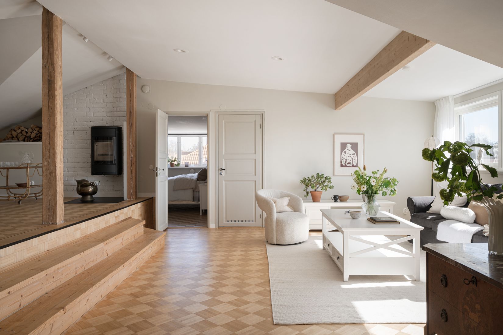 Planlösningen är social och inbjudande med öppen koppling mellan hall, vardagsrum och matsal. Ljuset strömmar in från flera fönster och skapar en härlig rymd. Köket är stilrent med blanka vita luckor, mörk bänkskiva och blått kakel som ger karaktär. Här lagar du mat med utsikt över den grönskande omgivningen. Lägenheten erbjuder tre sovrum, gott om förvaring samt ett rymligt badrum med tvättmaskin.