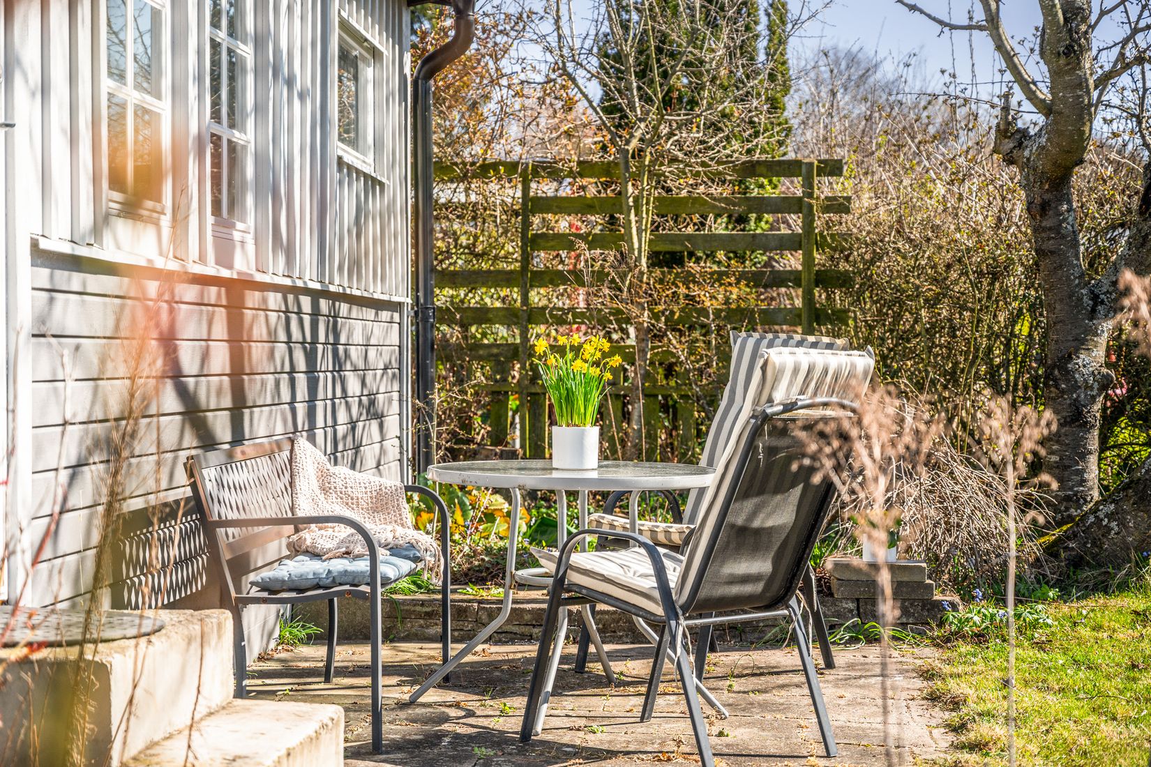 Trädgården är lättskött och smakfullt anlagd med en fin balans mellan gräsmatta, rabatter och fruktträd. Här finns gott om utrymme för både odling och avkoppling, oavsett om du vill skapa din egen köksträdgård, njuta av blomsterprakt eller bara luta dig tillbaka i solen.