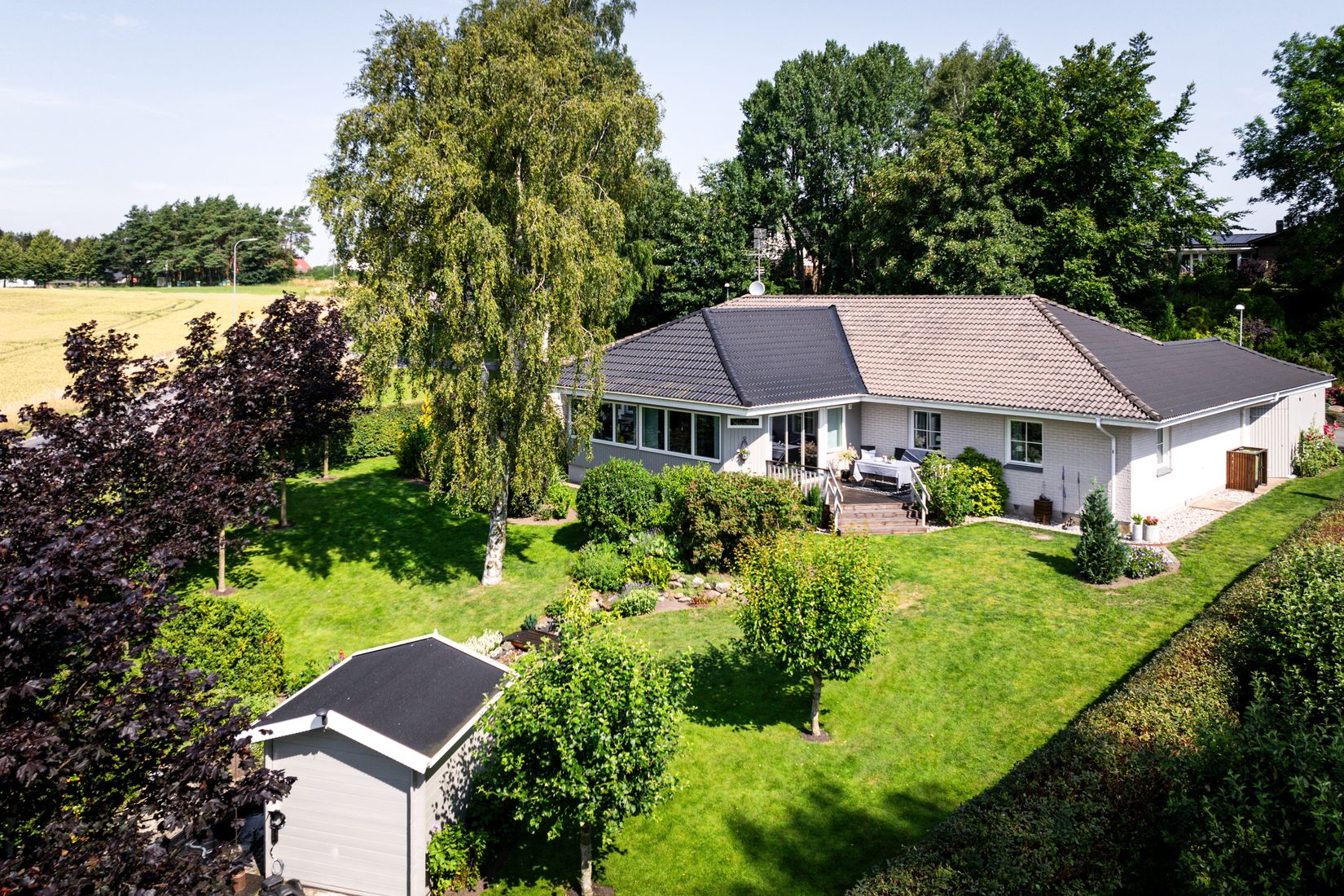På lugn återvändsgata ligger denna ytterst fina enplansvilla med vacker hörntomt. Du välkomnas av en stilren entrésida med stensättning, belysning, skiffer och växter. Stensatt uppfart med carport för två bilar och direkt access till groventrén samt förvaring i garage. Ett mycket välskött och gediget hus i genomgående bra skick med en härlig känsla av ljus och rymd. Boarean om 170 m² har dessutom en biarea om 40 m² i ett fantastiskt uterum som kan användas året runt med vattenburen golvvärme och fria vyer över fälten i söder.