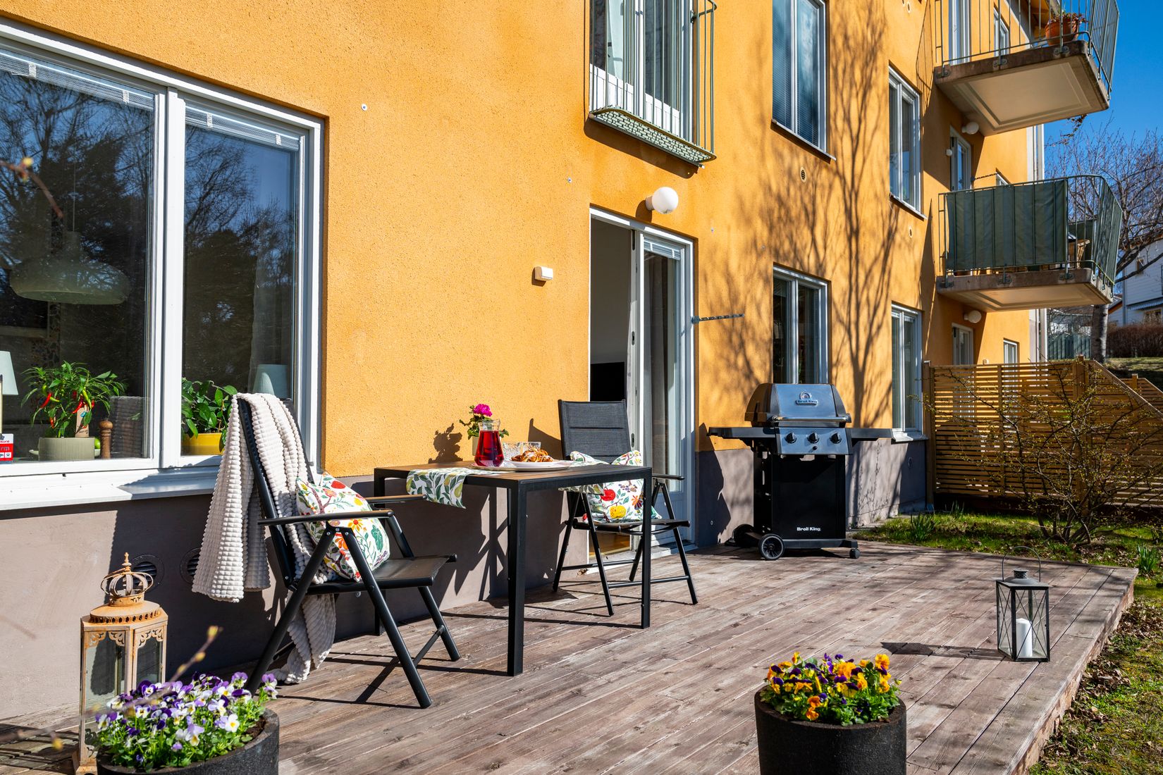 Från vardagsrummet når ni den fantastiska uteplatsen - en riktig pärla med gott om plats för loungemöbler, matgrupp och grill. Här kan ni njuta av soliga dagar och ljumma kvällar i en grönskande miljö.