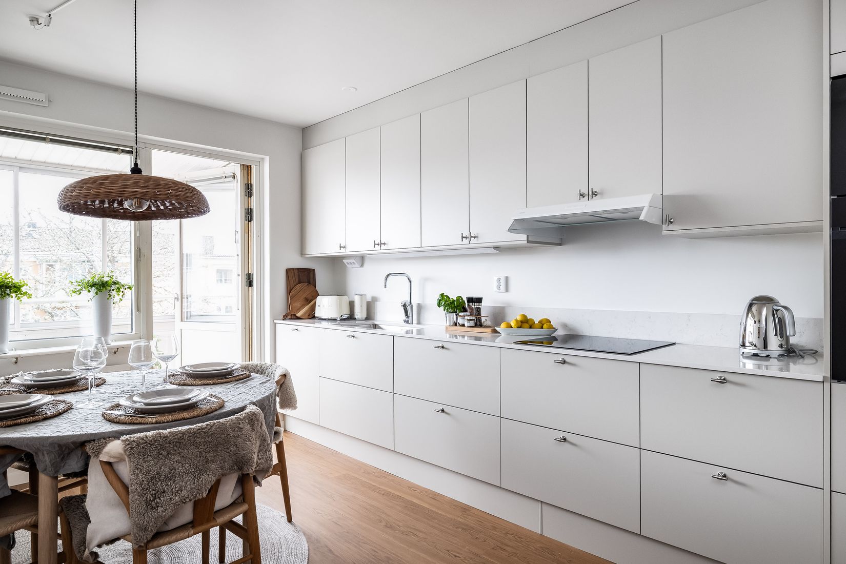 Köket är ett exklusivt HTH-kök i stilren design, utrustat med kvalitativa vitvaror från Siemens samt en elegant bänkskiva i sten. Här kombineras estetik och funktion på ett sätt som lyfter helhetsintrycket. Intill fönsterpartiet finns en naturlig plats för matgrupp samt utgång till den inglasade balkongen, ett extra rum som förlänger säsongen och blir en perfekt plats för både morgonkaffet och sociala stunder.