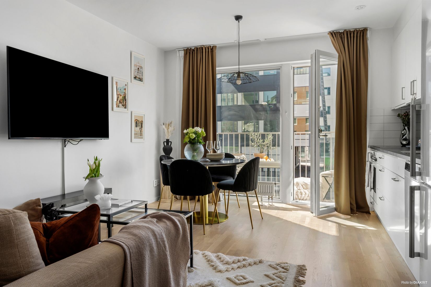 Välkommen till denna välplanerade etta på Dockan. Bostaden erbjuder en öppen och social del mellan kök och vardagsrum med fint ljusinsläpp från stora fönsterpartier och utgång till balkong. Här finns plats för både soffgrupp och matbord, och rummet upplevs ljust och lättmöblerat.