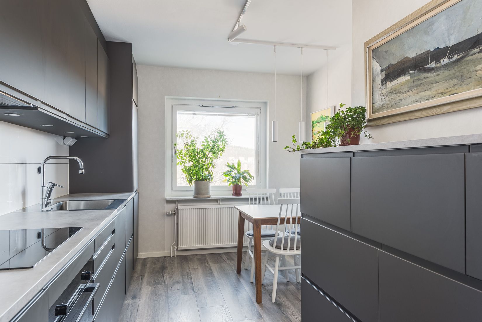 Det stilrena köket går i grå toner och bjuder på goda arbetsytor samt trevlig utsikt mot Norra Berget. Sovrummet är rymligt och utrustat med garderober som ger bra förvaringsmöjligheter. Det helkaklade badrummet är fräscht och funktionellt med installerad tvättmaskin.