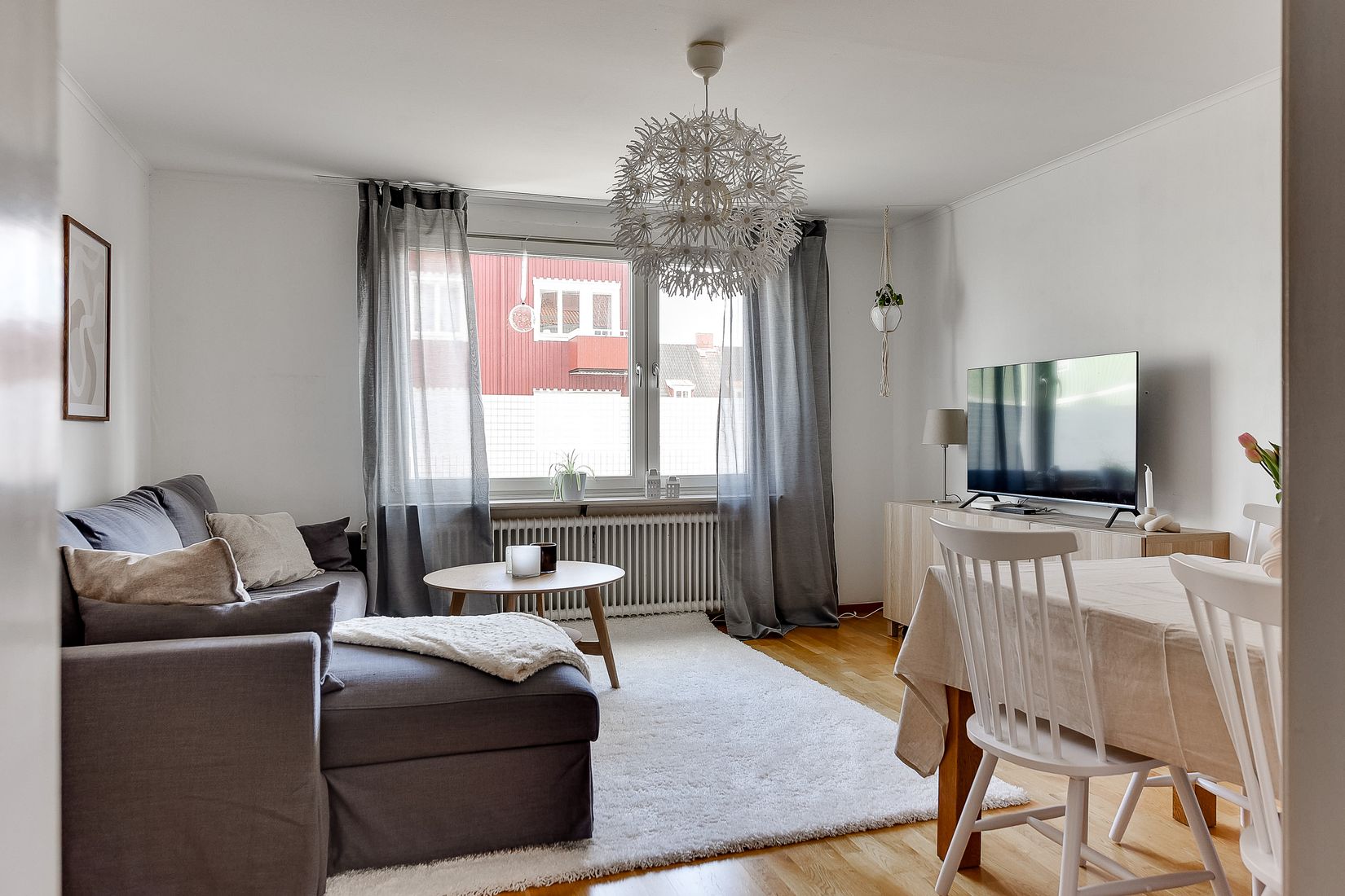 Vardagsrummet är lättmöblerat och rymmer såväl soffgrupp som matplats eller arbetsyta. Ljusa väggar och parkettgolv skapar en trivsam och harmonisk känsla. Badrummet är renoverat i stilrena materialval med våtrumsmatta på väggar och golv och utrustat med wc, kommod, duschhörna, handdukstork samt egen kombinerad tvättmaskin – bekvämt och funktionellt.
