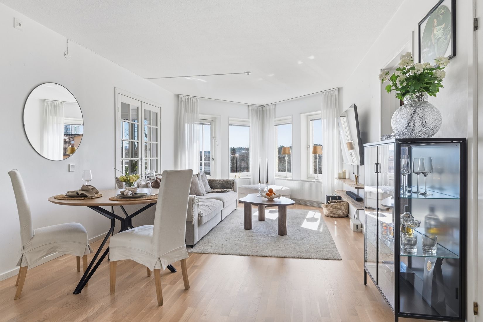 Detta hem präglas av genomgående ljusa materialval som vitpigmenterat golv, ljusmålade väggar, renoverat kök och renoverat badrum. Tack vare de stora fina fönsterpartierna och den öppna planlösningen ger ett härligt naturligt ljusinsläpp. Den inglasade balkongen ligger i söderläge vilket ger sol i princip hela dagen från morgon till kväll. Vidare har lägenheten ett ordentligt sovrum med gott om förvaring, en hall med möjlighet till klädavhängning/garderober, rymligt vardagsrum med matplats och möjlighet till olika typer av möblering. Separat förråd finns.