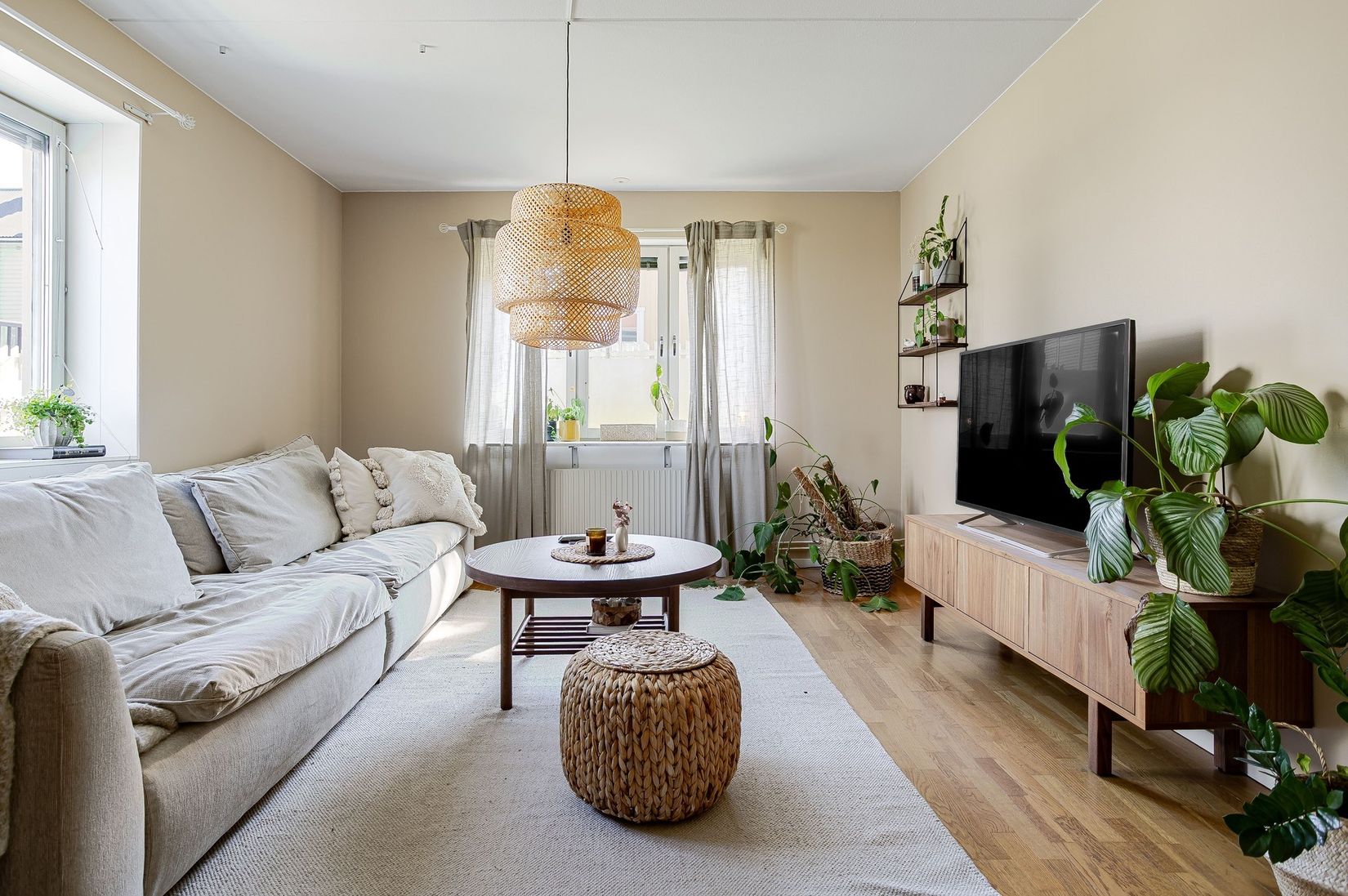 Vidare in i lägenheten öppnar det ljusa vardagsrummet upp sig, en trivsam och luftig yta där stora fönsterpartier släpper in rikligt med dagsljus och skapar en härlig atmosfär. Här finns gott om plats för både en bekväm soffgrupp och ytterligare möblering efter behov.