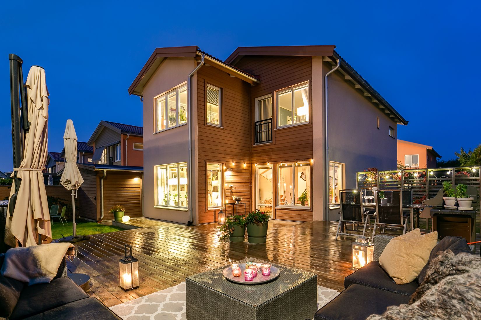 Trivsam utemiljö med generösa och inbjudande uteplatser, lättskött gräsmatta på baksidan i bästa läget med utsikt mot öppet landskap som ramas in av insynsskyddande häck. På framsidan finns en praktisk carport med två förrådsdelar och tillhörande uppfart där ni kan parkera ytterligare en bil. Telia fiber indraget!