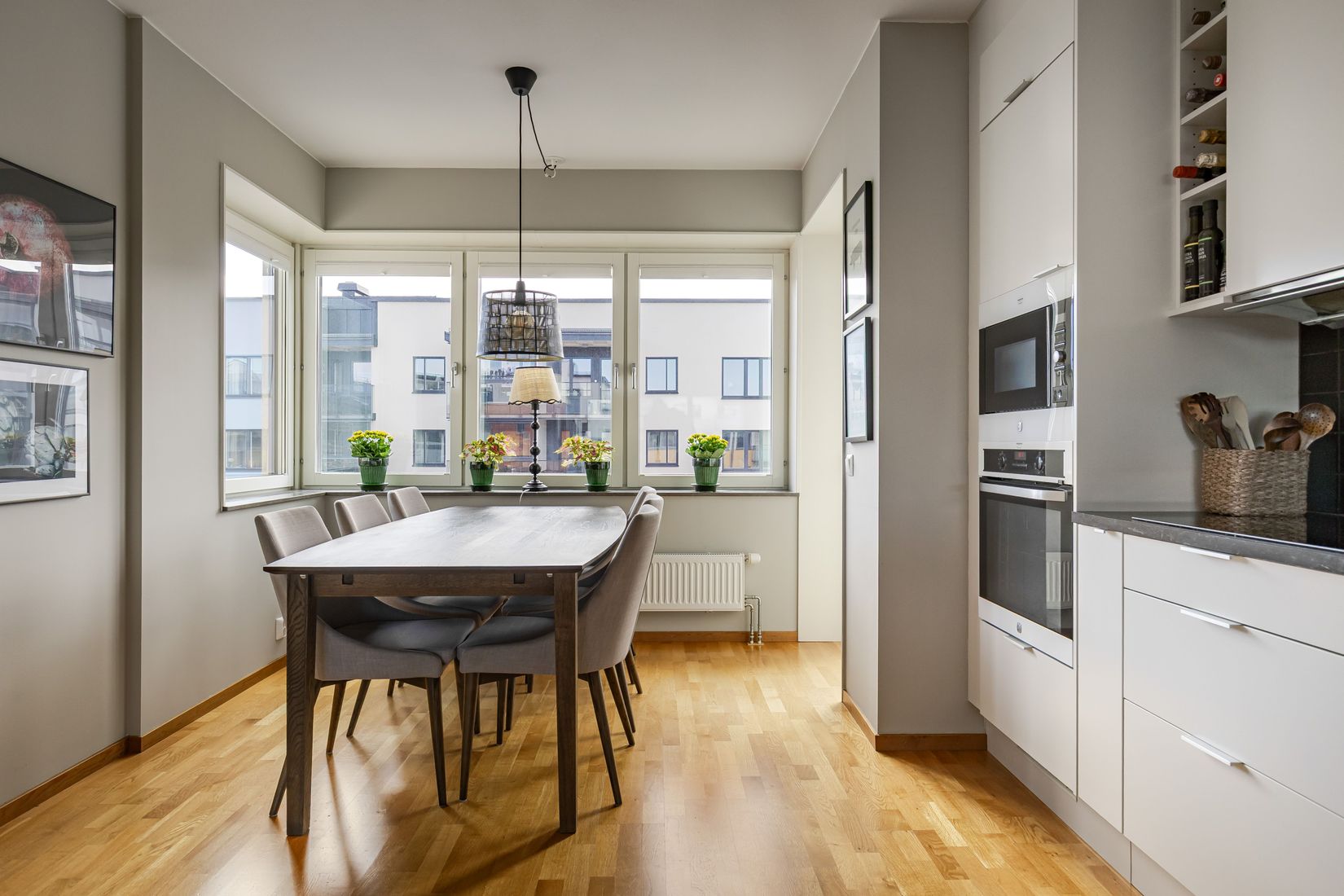 Vardagsrummet är generöst tilltaget och präglas av stora fönster som skapar ett fint ljusinsläpp och en luftig känsla. Härifrån nås den inglasade balkongen i norrläge med utsikt mot den lugna innergården – en trivsam och skyddad miljö som kan nyttjas större delen av året. Bostaden rymmer tre rogivande sovrum, vilket gör den idealisk för såväl familjen som för dig som önskar ett hemmakontor eller gästrum. Vidare finns två helkaklade badrum, varav det ena är utrustat med tvättmaskin och torktumlare för en bekväm vardag. Lägenheten erbjuder dessutom gott om förvaring samt ett tillhörande källarförråd.