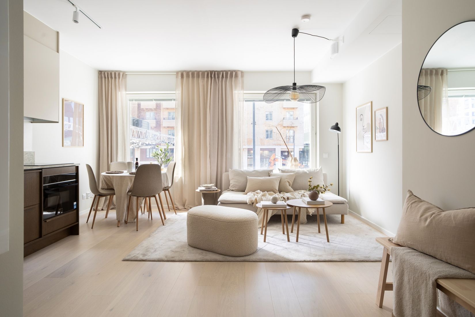 Bostaden präglas av en genomtänkt planlösning med öppna ytor, stora fönsterpartier och sobra färgval. Ljuset flödar in från de vackra fönstervalven som är en blinkning till såväl historiska järnvägsstationer som sakrala kyrkorum – en arkitektonisk signatur för Lokstallarna. Interiören har en industriell touch med noga utvalda materialval som binder samman bostad och fastighet: bland annat köksdetaljer i mörkt trä, stilrena stenbänkskivor och designade badrumsarmaturer.