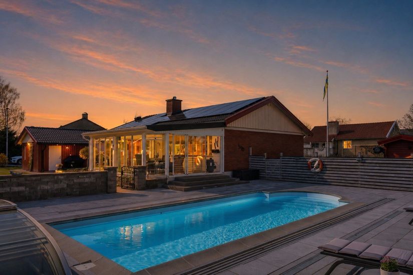 Det stora, inglasade uterummet med vattenburen golvvärme förlänger säsongen rejält. Här finns gott om plats för större möblemang och ni njuter av utsikten över poolen och trädgården – allt i bästa söderläge.