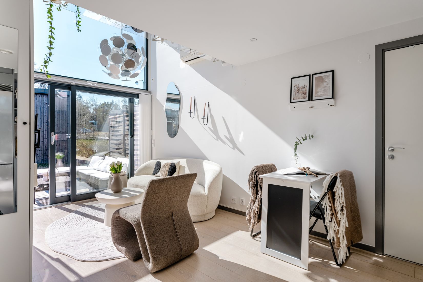 Interiören präglas av noggrant utvalda materialval med ett kvalitetskök utrustat med stenbänkskiva och stänkskydd i vacker kalksten, breda trägolv samt ett smakfullt inrett badrum som tillsammans skapar ett tidlöst och modernt intryck. De stora glaspartierna ger ett generöst ljusinsläpp och bidrar till en luftig känsla, samtidigt som bostaden erbjuder välplanerade och sociala ytor.