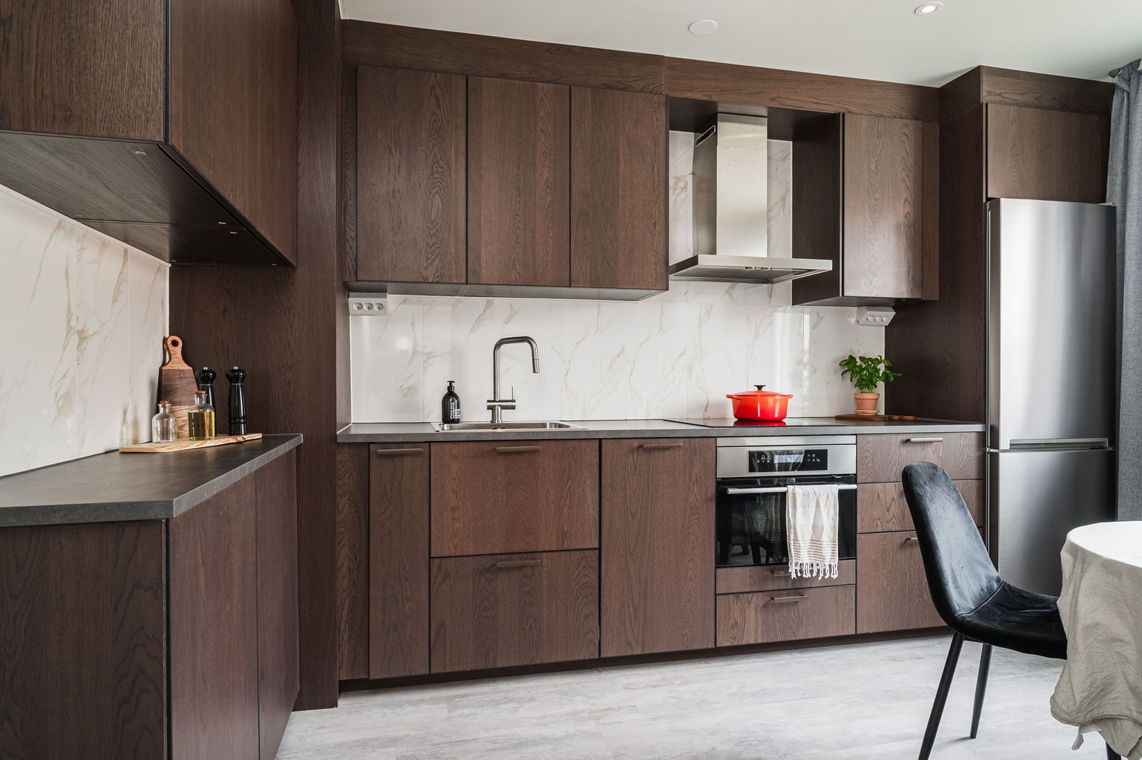 Hallen välkomnar med slitstarkt klinkergolv. Som en modern bonus är bostaden utrustad med spotlights i taket och ett smart Plejd-system som gör det möjligt att styra belysning och exempelvis kaffebryggare direkt via mobilen.