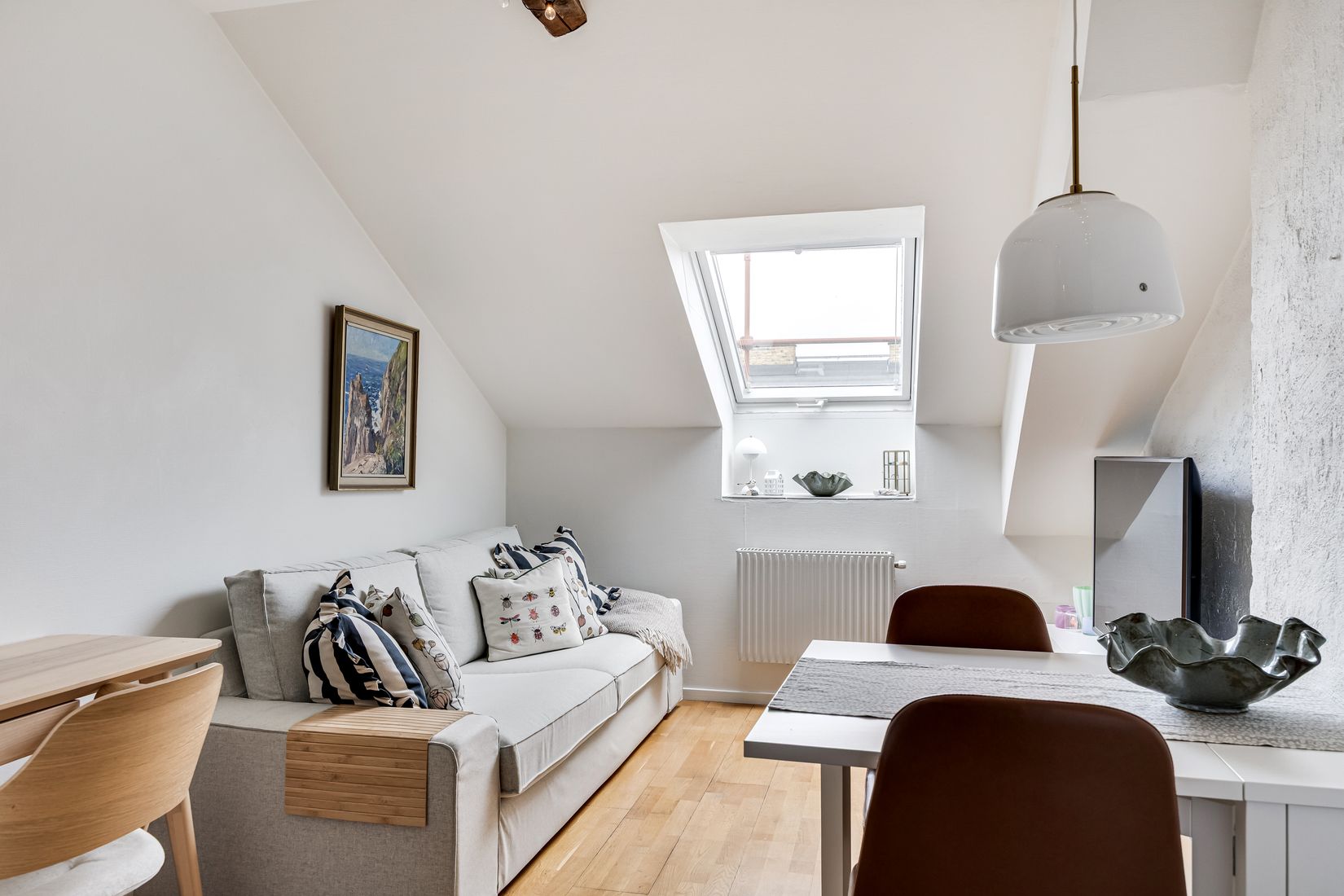Vardagsrum - Ljust rum med parkettgolv och ljusa väggar. Här finns plats för både soffgrupp och matbord. Takfönster bidrar med fint ljusinsläpp och förstärker den luftiga känslan, medan synliga bjälkar ger bostaden charm.