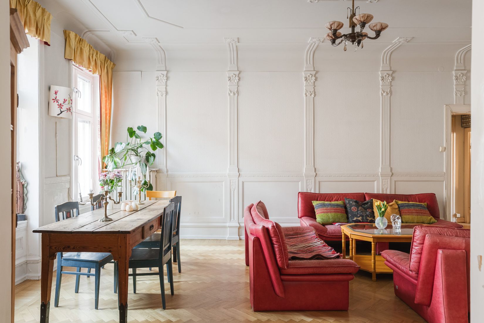 Redan vid första steget in möts du av en känsla av rymd och tidlös elegans. Den generösa takhöjden om hela 3,1 meter skapar ett storslaget intryck och låter ljuset flöda fritt genom rummen. Vackra stuckaturer och takrosetter skapar karaktär till boendet, medan de klassiska fiskbenslagda trägolven leder dig vidare genom bostaden med en varm och inbjudande känsla. Spegeldörrar och höga golvsocklar förstärker den gedigna sekelskifteskaraktären och ger en harmonisk helhet där varje rum känns genomtänkt.