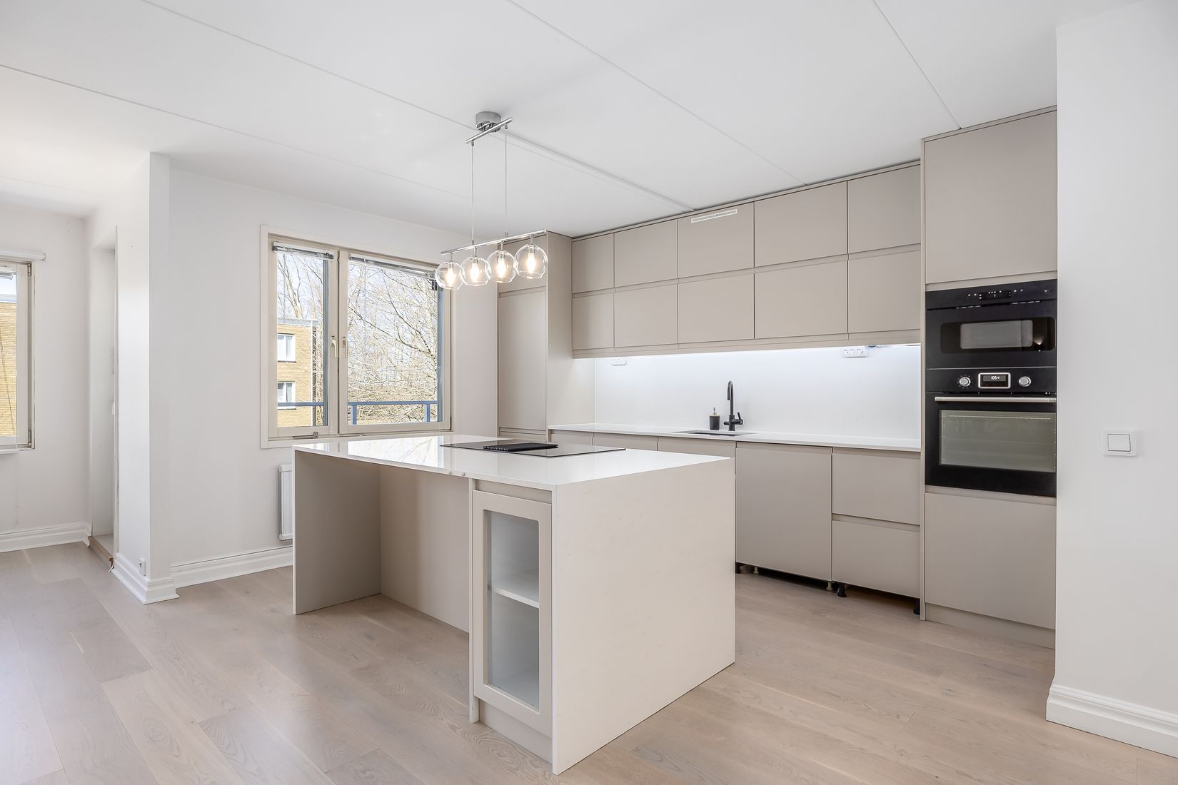Köket är smakfullt utformat med exklusiva materialval och moderna lösningar som gör det lika funktionellt som estetiskt tilltalande. Genomgående präglas bostaden av hög standard och en enhetlig design.