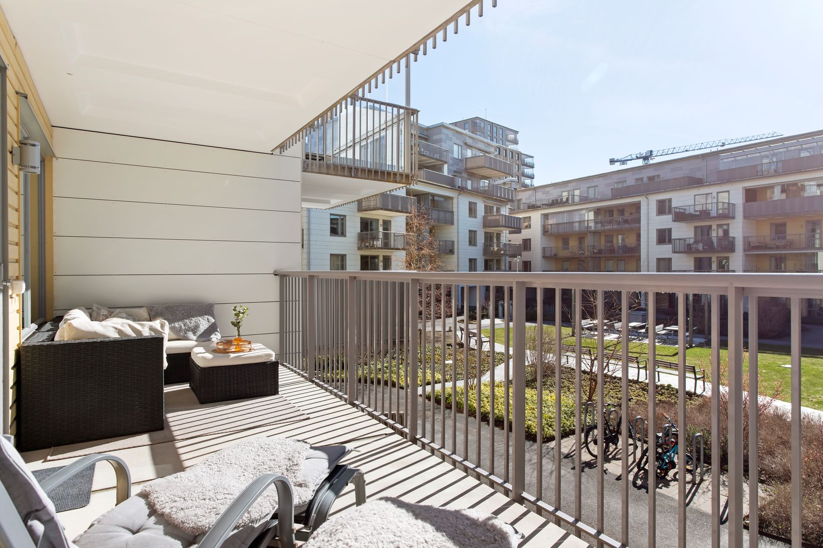 Från vardagsrummet nås den rymliga balkongen om hela 14 kvm i soligt söderläge, en perfekt plats för både avkoppling och sociala stunder. Här finns gott om plats för loungemöbler, odlingar eller middagar i kvällssolen.