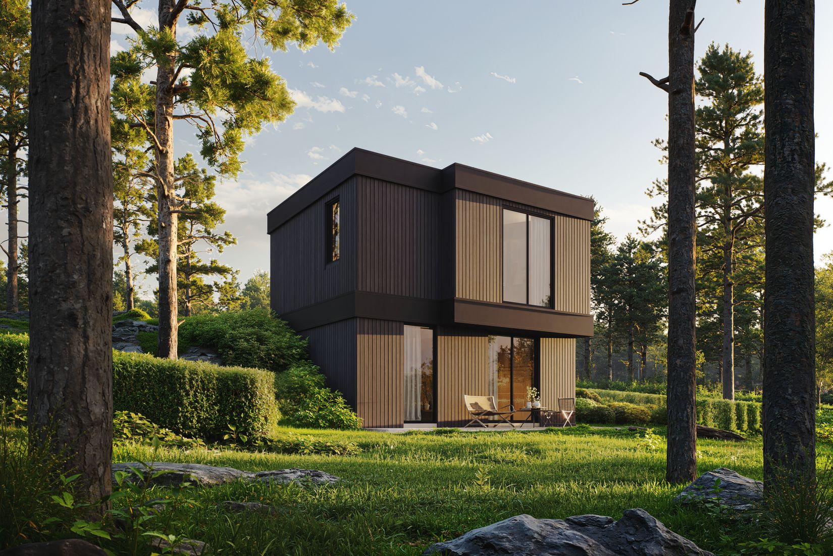 Bakom projektet står Stork Bostad, som med inspiration från internationell resortdesign skapat ett bostadsområde där varje detalj är noga genomtänkt. Stora glaspartier släpper in ljuset, naturmaterial som trä och sten skapar en varm, tidlös känsla – och öppna ytor förstärker känslan av frihet. Fasaderna i linoljebehandlad furu smälter in i omgivningen, medan detaljer i antracitgrå plåt ger husen en modern och stilren karaktär.