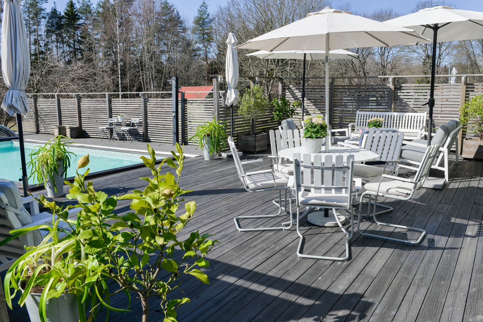 Ett generöst pooldäck bjuder in till lata sommardagar, svalkande dopp och grillkvällar som övergår i ljusa nätter. På tomten finns dessutom en jacuzzi, ett poolhus, ett extra isolerat hus (perfekt som gästhus, kontor eller tonårsdröm) samt förråd och odlingsmöjligheter för den med gröna fingrar – eller ambitionen att få det. Dessutom finns här redan uppväxta fruktträd och bärbuskar.