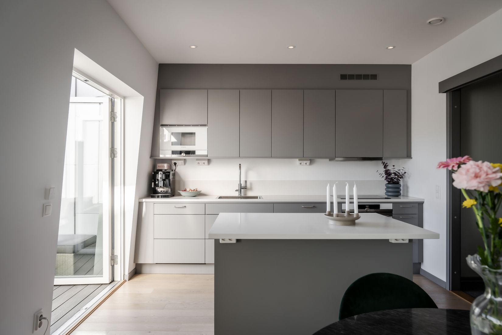 Bostaden välkomnar med en rymlig entré med goda förvaringsmöjligheter i garderober. Vidare öppnar hemmet upp sig mot det stora vardagsrummet i öppen planlösning mot köket, en social och inbjudande yta perfekt för både vardag och umgänge. Köket är modernt och stilrent i en elegant grå kulör som skapar en snygg kontrast mot den ljusa bänkskivan i sten. Den centrala köksön blir en naturlig samlingspunkt i bostaden och erbjuder både extra arbetsyta och sittplatser, perfekt för såväl matlagning som socialt umgänge. Här finns full maskinell utrustning och goda arbetsytor för den matlagningsintresserade.