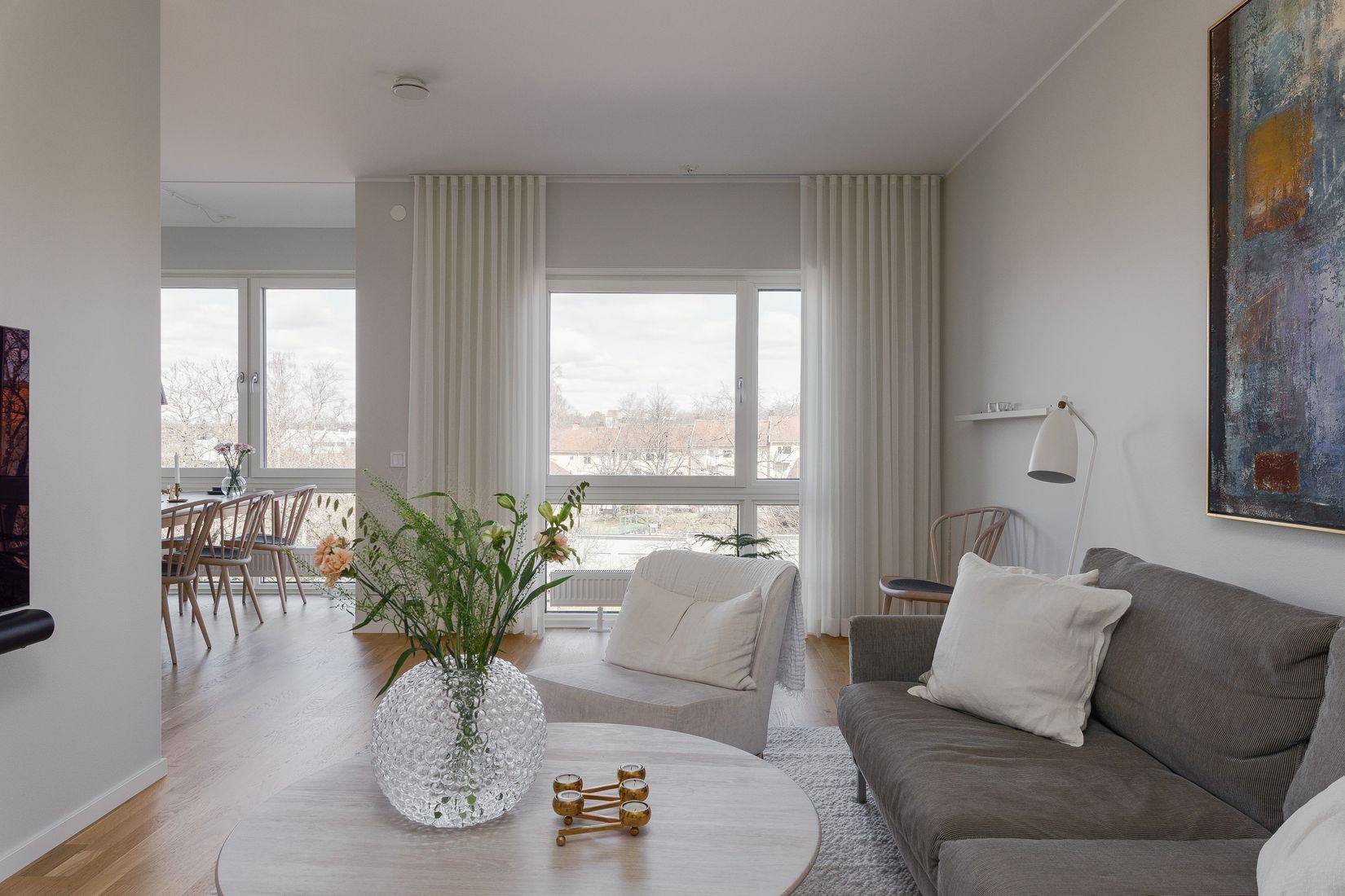 Redan i hallen möts ni av goda avhängningsmöjligheter och bra förvaring. Bostadens genomtänkta planlösning skapar fina sociala ytor, där köket med generös matplats och vardagsrummet samspelar på ett naturligt sätt. Vardagsrummet präglas av stora fönsterpartier som släpper in rikligt med ljus och bidrar till en luftig och inbjudande känsla. De tre sovrummen erbjuder en avskild och rofylld miljö, samtliga med ett lugnt läge mot innergården. Det större sovrummet har utgång till en rymlig balkong med plats för både loungemöbler och växtlighet – en trivsam solig plats för såväl avkoppling som sociala stunder. Bostaden erbjuder ett helkaklat badrum med tvättmöjligheter samt en stilren, helkaklad gäst-WC.