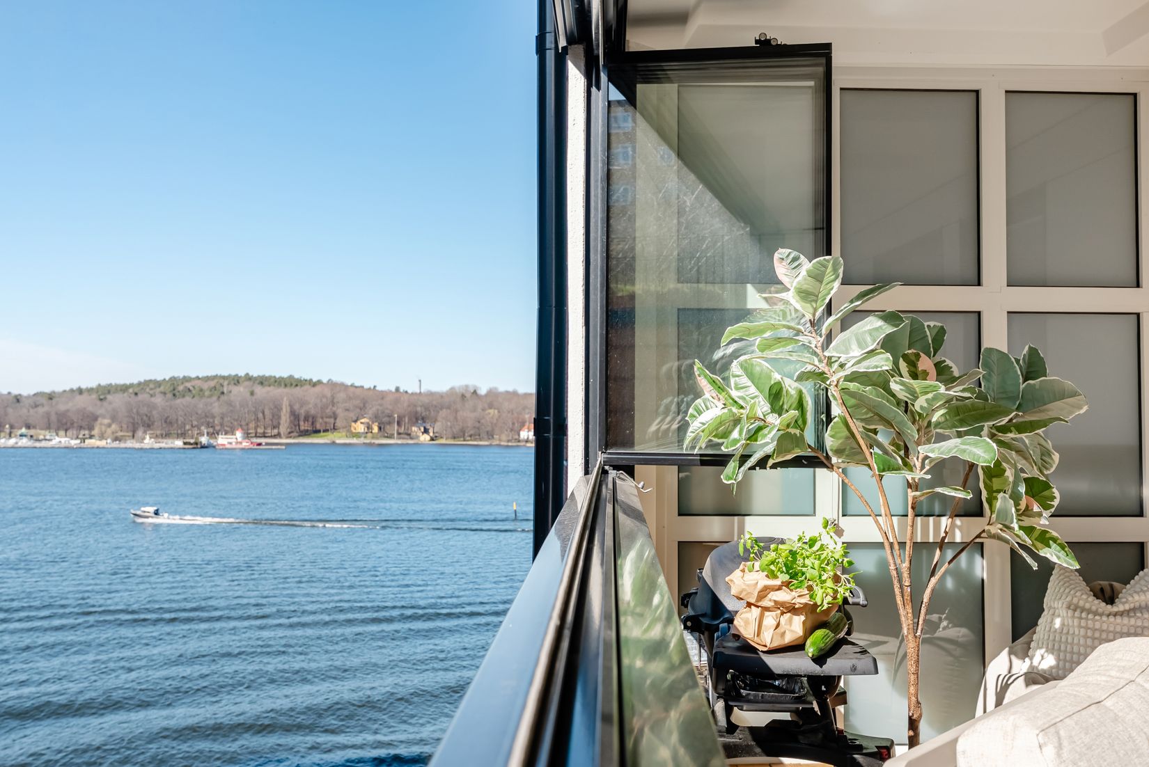 En av bostadens absoluta höjdpunkter är den underbara inglasade balkongen med havsutsikt – en perfekt plats att njuta av morgonkaffet, långa middagar eller bara koppla av året runt oavsett väder.