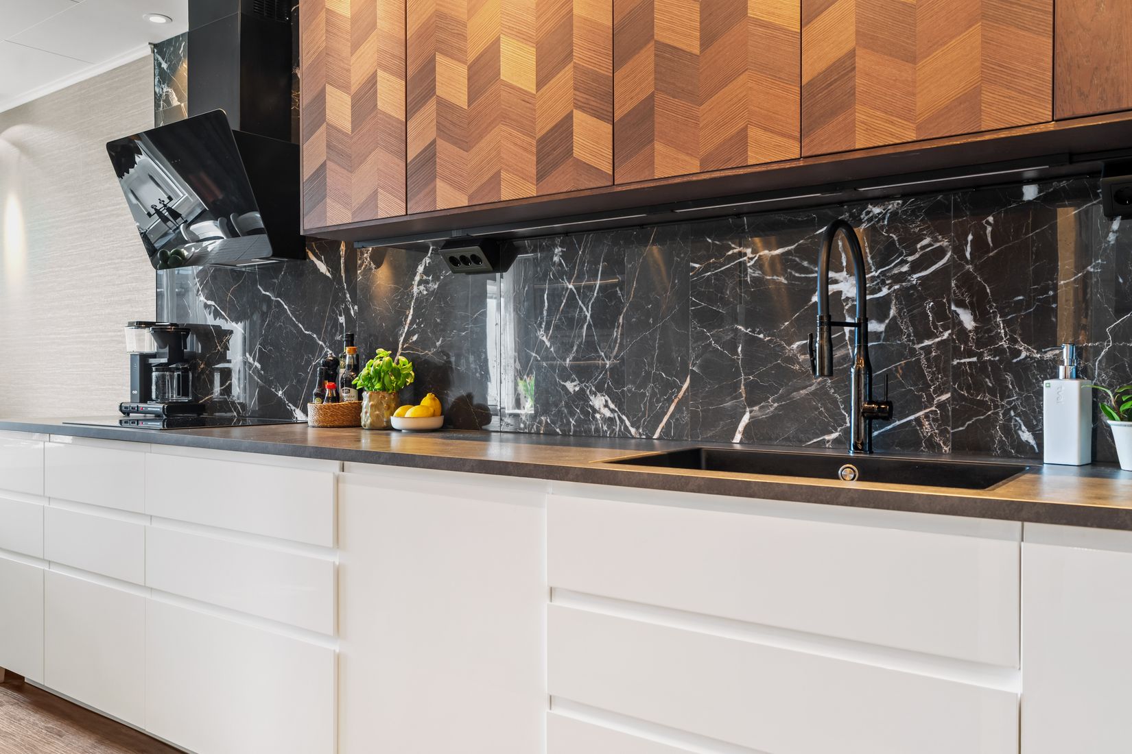 Denna trivsamma bostad om 83 kvm bjuder på ett stilrent och välutrustat kök med moderna vitvaror såsom stor kyl och frys, diskmaskin, induktionshäll, fläkt, ugn och mikro – en perfekt plats för både vardagsmatlagning och trevliga middagar.