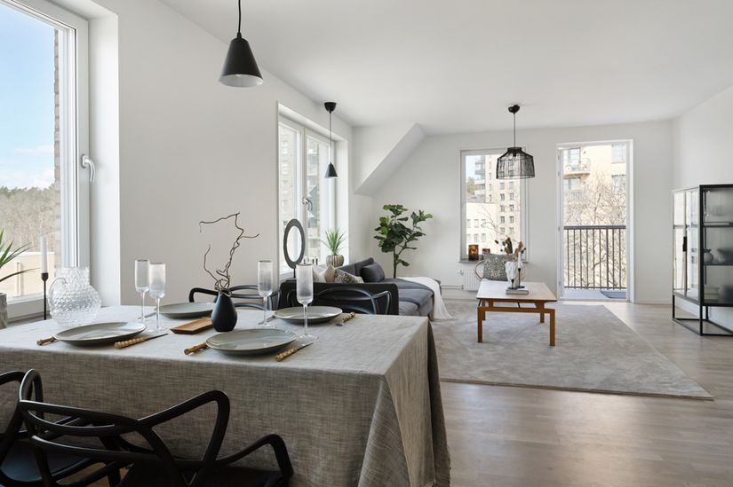 Genomgående målade väggar och parkettgolv av ek i hela lägenheten.