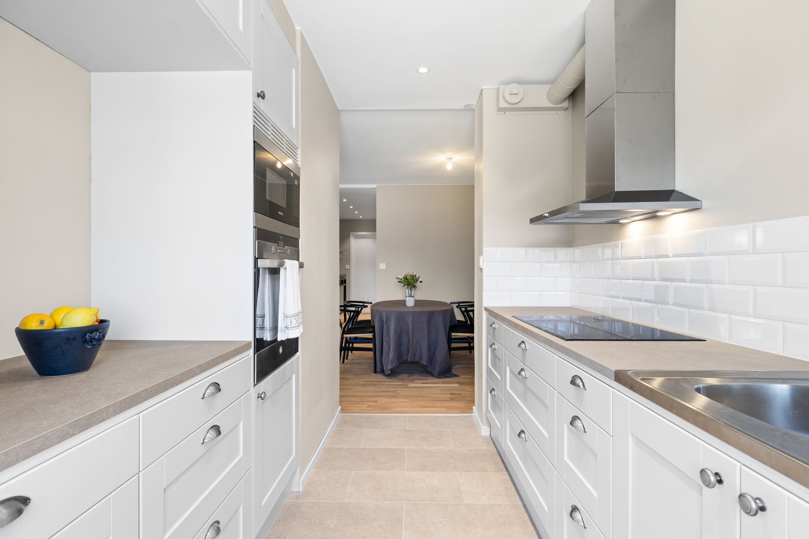 Redan i hallen möts du av stilrent klinkergolv som sedan följer vidare in i både kök och badrum och skapar en snygg röd tråd genom bostaden. Köket från Vedum går i elegant grått och erbjuder både funktion och estetik i perfekt balans. Här finns gott om arbetsyta och förvaring – ett kök att trivas i.