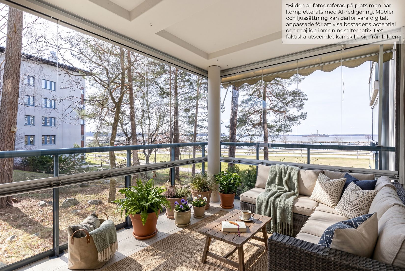 Hjärtligt välkommen till denna unika 4:a om 110,6 kvm! Utsökt boende vilket karaktäriseras av väl tilltagen och inglasad balkong med sjöutsikt samt magisk och rymlig uteplats innanför grönskande häck (insynsskyddad sommartid). Balkong och uteplats åt varsitt väderstreck. Trevligt vardagsrum med ljusinsläpp från två väderstreck samt värmande kamin. Utöver detta välplanerat kök, tre rogivande sovrum, badrum med tvättmaskin/torktumlare samt separat gäst-WC.