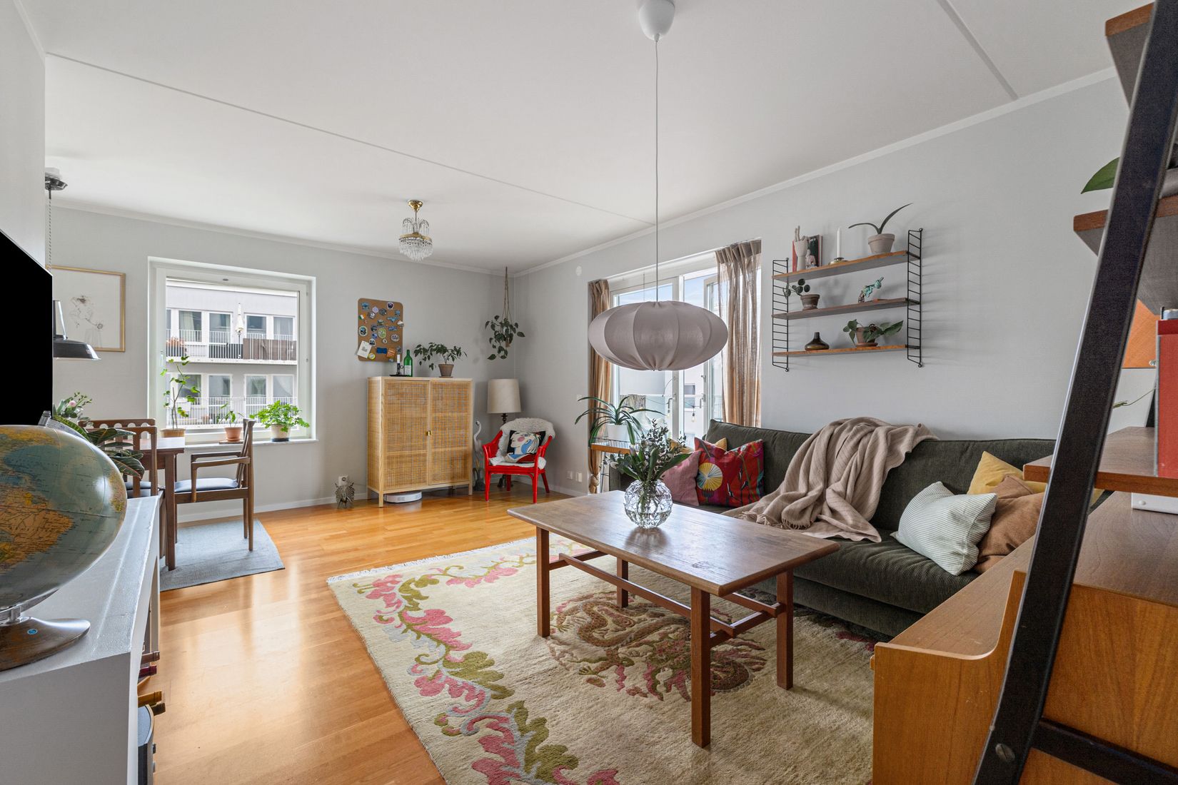 Bostaden präglas av ett fint ljusinsläpp tack vare fönster i två väderstreck och en luftig planlösning mellan kök och vardagsrum som skapar en social och inbjudande miljö. Härifrån når du även den stora, möblerbara balkongen – en perfekt plats för både avkoppling och umgänge.