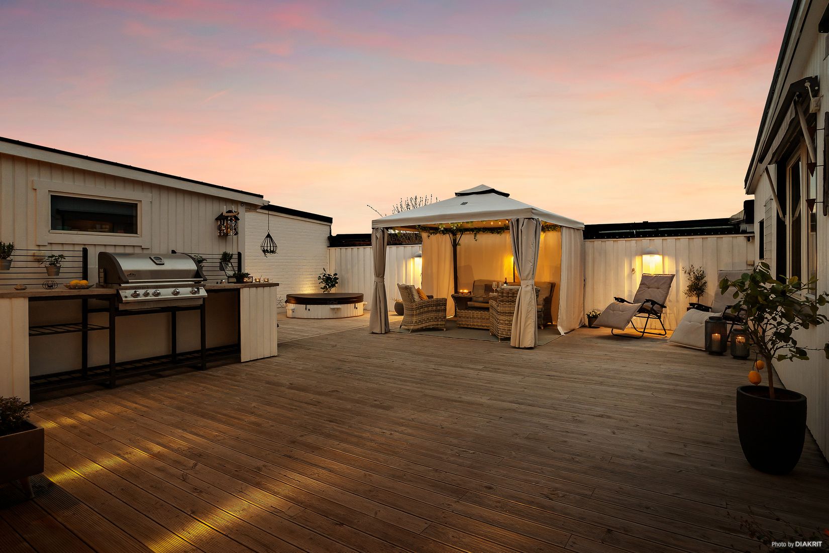 Uteplatsen erbjuder såväl sol från morgon till kväll och dessutom gott om plats för loungemöblemang, matplats, spabad eller annat som behoven kräver.