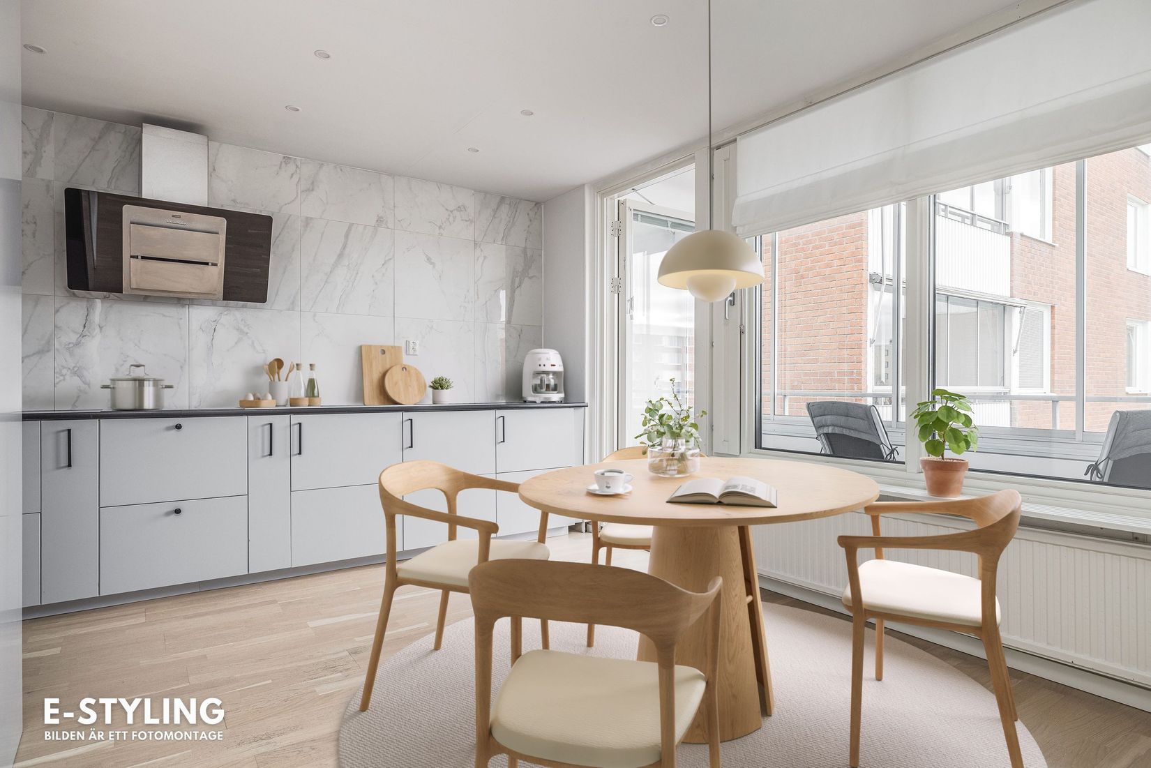 En bostad med genomgående renoverade ytskikt, helkaklat badrum, två toaletter och stort och smakfullt kök där ni också har direkt tillgång till den inglasade balkongen i söderläge. Föreningen har dessutom en aktiv diskussion att göra balkongerna större! Här är ett hem med stora och sociala rum intill varandra, luftiga sovrum med smarta förvarings ytor som skapar praktisk funktion kombinerat med elegans.