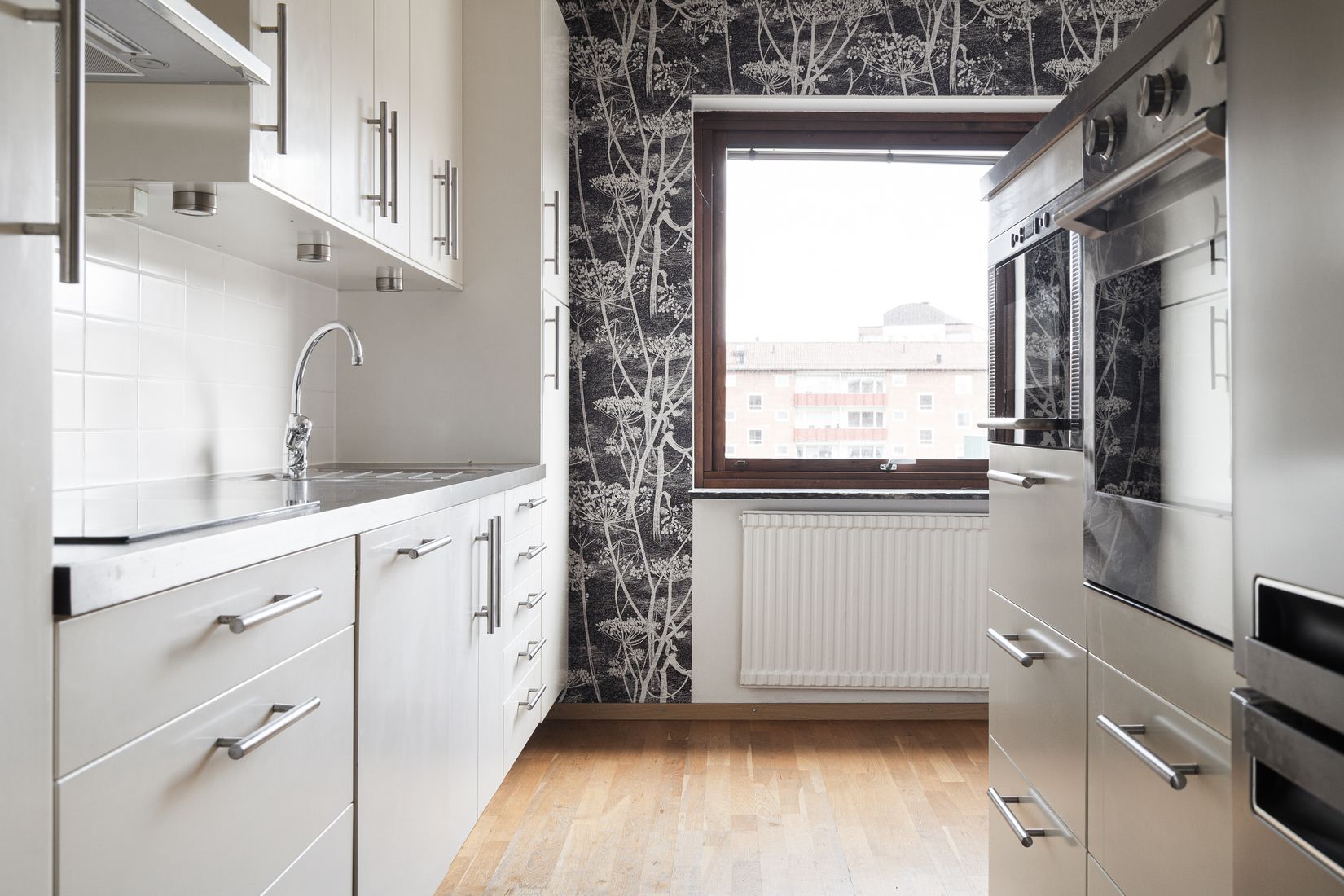 Köket är stilrent med vita skåpsluckor och har en trevlig matplats intill fönstret. Här finns gott om förvaring och arbetsyta samt kyl/frys.