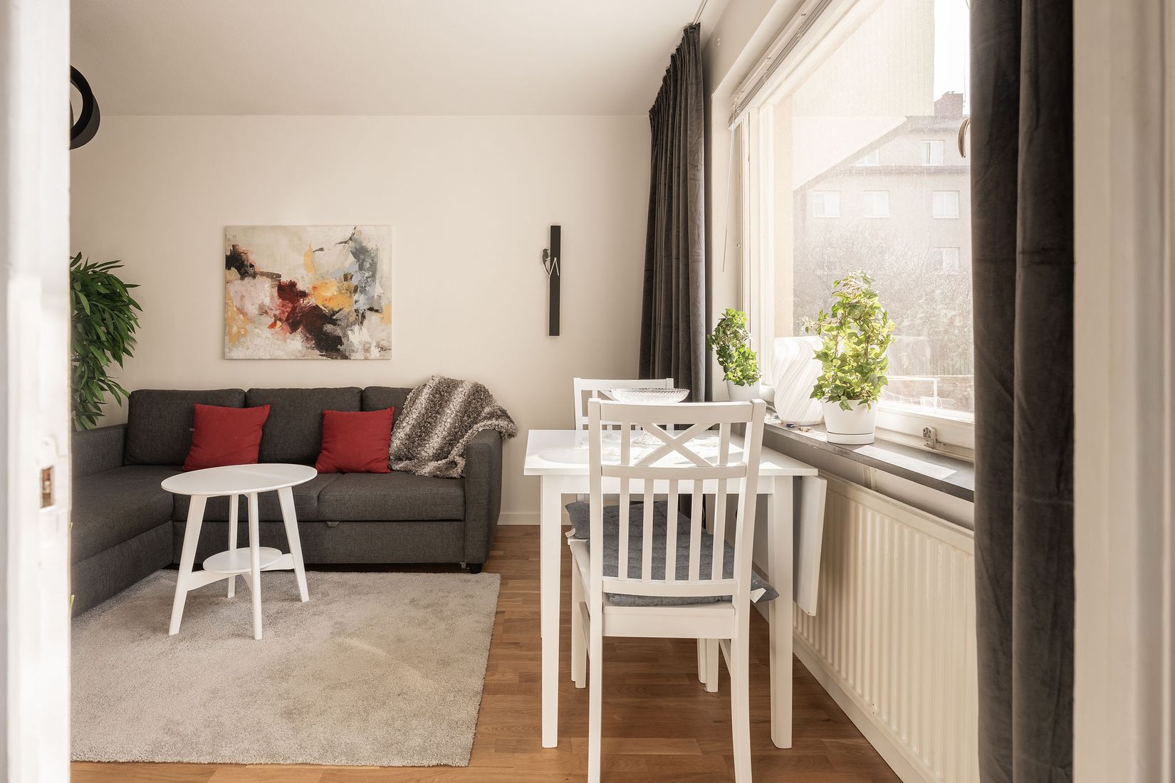 Bostaden erbjuder en smart planlösning med härligt ljusinsläpp som skapar en luftig och inbjudande känsla. Allrummet är flexibelt och rymmer enkelt både säng och soffa, perfekt för dig som vill maximera varje kvadratmeter.