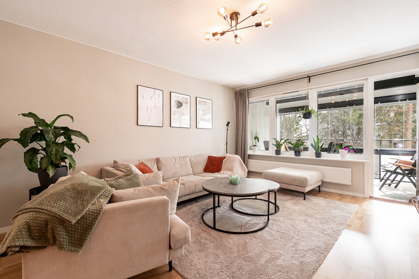 I hjärtat av bostaden finner du det stora vardagsrummet som leder ut till den inglasade balkongen som förlänger säsongen och bjuder på en lugn plats att koppla av.