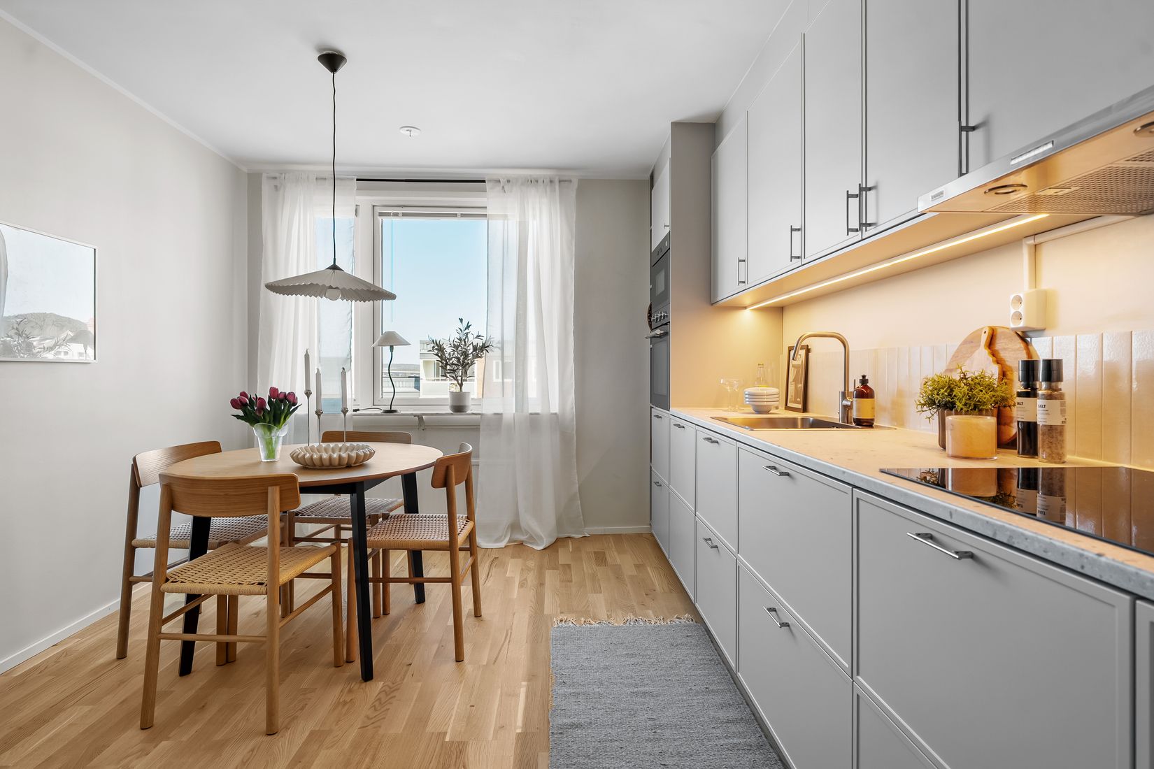 Det stilrena köket är helt nytt och fullt utrustat med integrerad kyl och frys i fullhöjd, induktionshäll, fläkt, inbyggd ugn och mikro samt integrerad diskmaskin. Här finns även en naturlig matplats intill fönster med fin utsikt.
