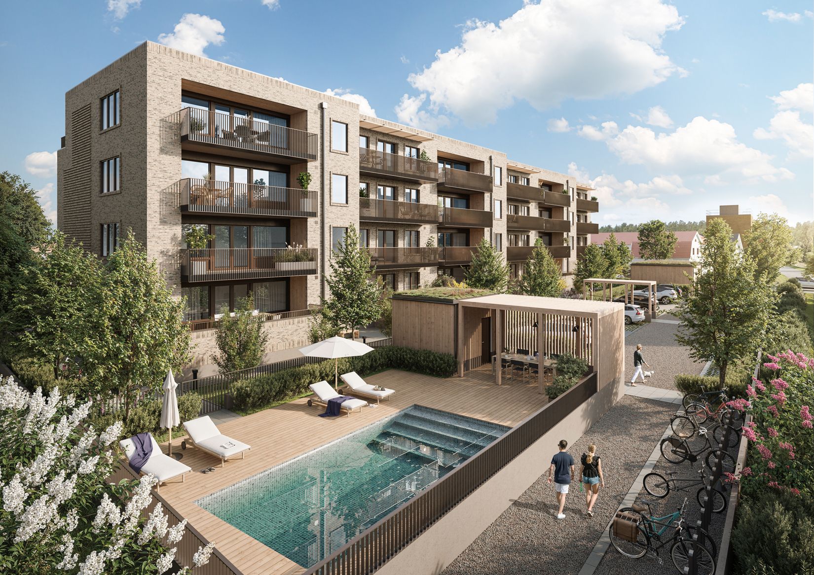 Den gemensamma utemiljön kommer att bjuda på gröna ytor för lek, omsorgsfullt anlagda planteringar samt ett trevligt poolområde med paviljong - en naturlig samlingsplats för härliga stunder tillsammans med familj, vänner och grannar.