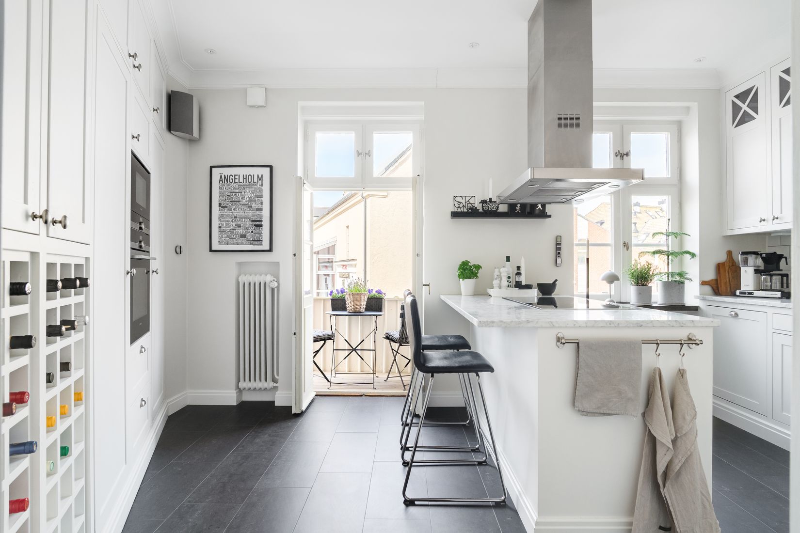 Moderna inslag har integrerats på ett mycket stilfullt vis, där uppvärmt klinkergolv, ett smakfullt renoverat badrum och diskret infällda spotlights i det äldre innertaket samverkar med ett högtalarsystem från Bang & Olufsen som löper genom hela bostaden och enkelt styrs via app.