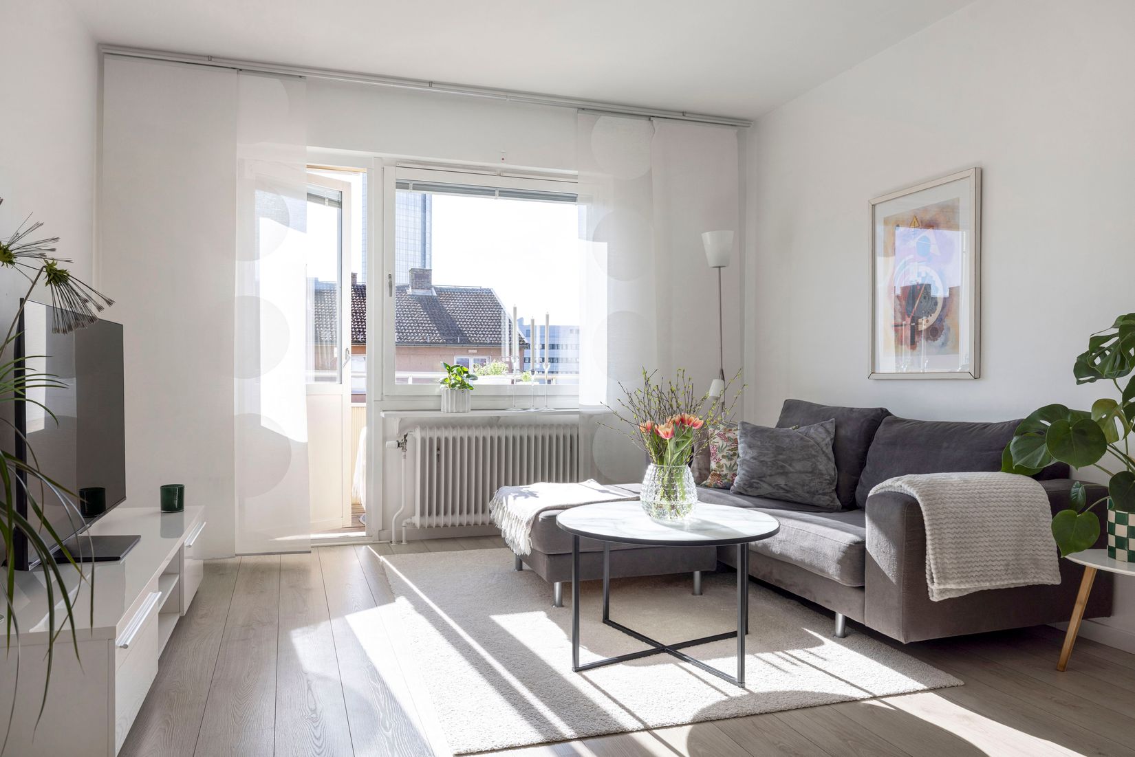 Vardagsrummet är lättmöblerat och har utgång till en balkong med markis – en perfekt plats för avkoppling. Köket från HTH är både funktionellt och stilfullt med sin karakteristiska bänkskiva i kvartskomposit (Silestone). Kombinationen av svarta underskåp, vita överskåp och integrerade vitvaror ger ett modernt och tidlöst uttryck.