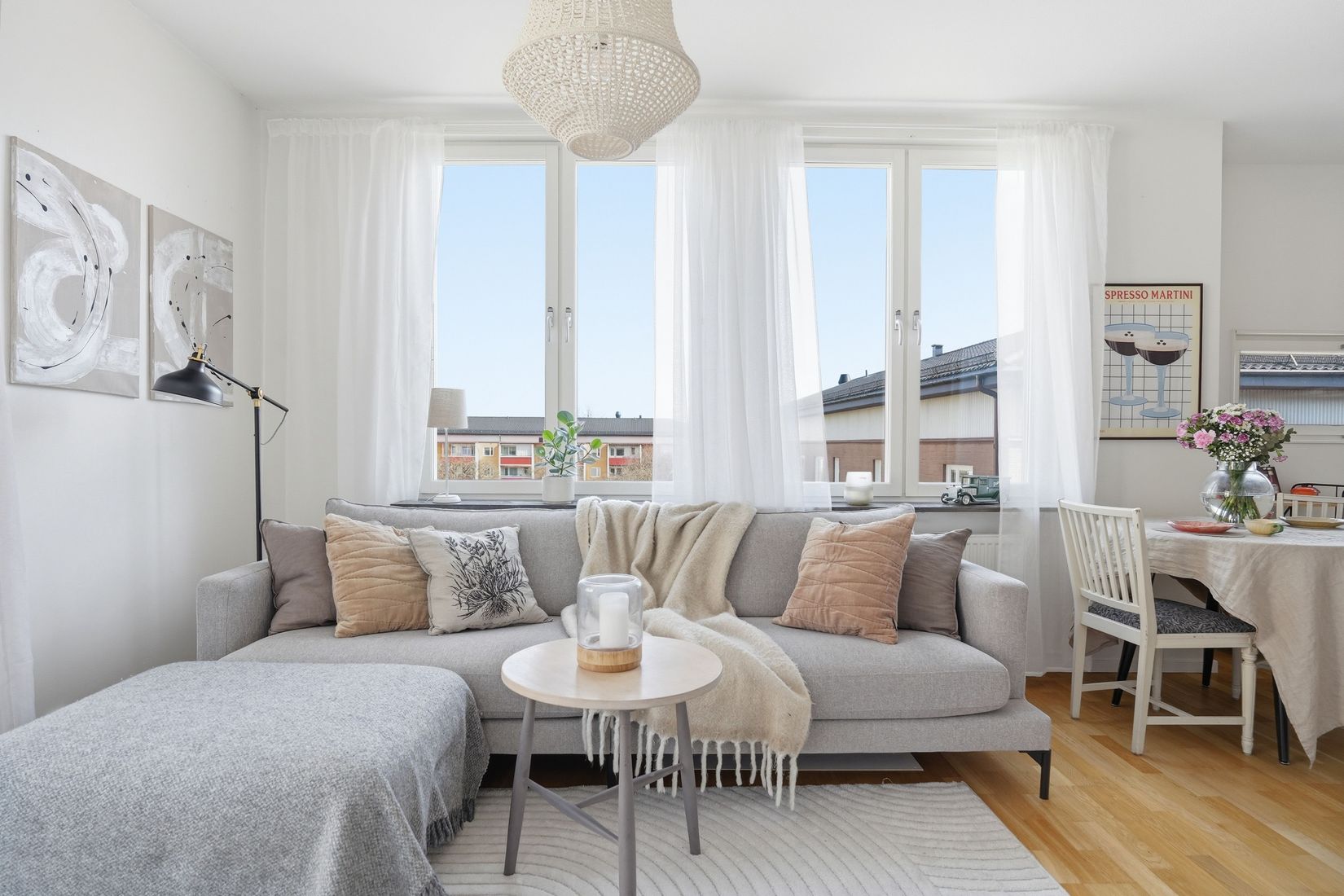 Bostaden erbjuder ett fräscht och fullt utrustat kök i öppen planlösning mot vardagsrummet, vilket skapar en luftig och social känsla. Här finns plats för både matbord och soffa, och från rummet nås den högt och fritt belägna balkongen i eftermiddagssol!