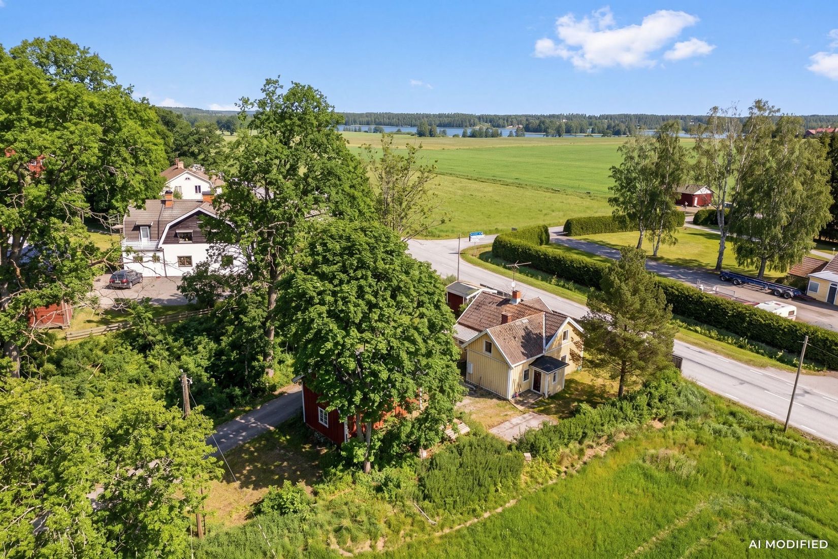 På tomten finns även en mindre komplementbyggnad med enklare utförande samt en träaltan i anslutning till huset. Tomten är uppvuxen med enklare trädgård och omges delvis av staket. Läget erbjuder fri vy över åkermark och ett lugnt, avskilt intryck med närhet till natur.